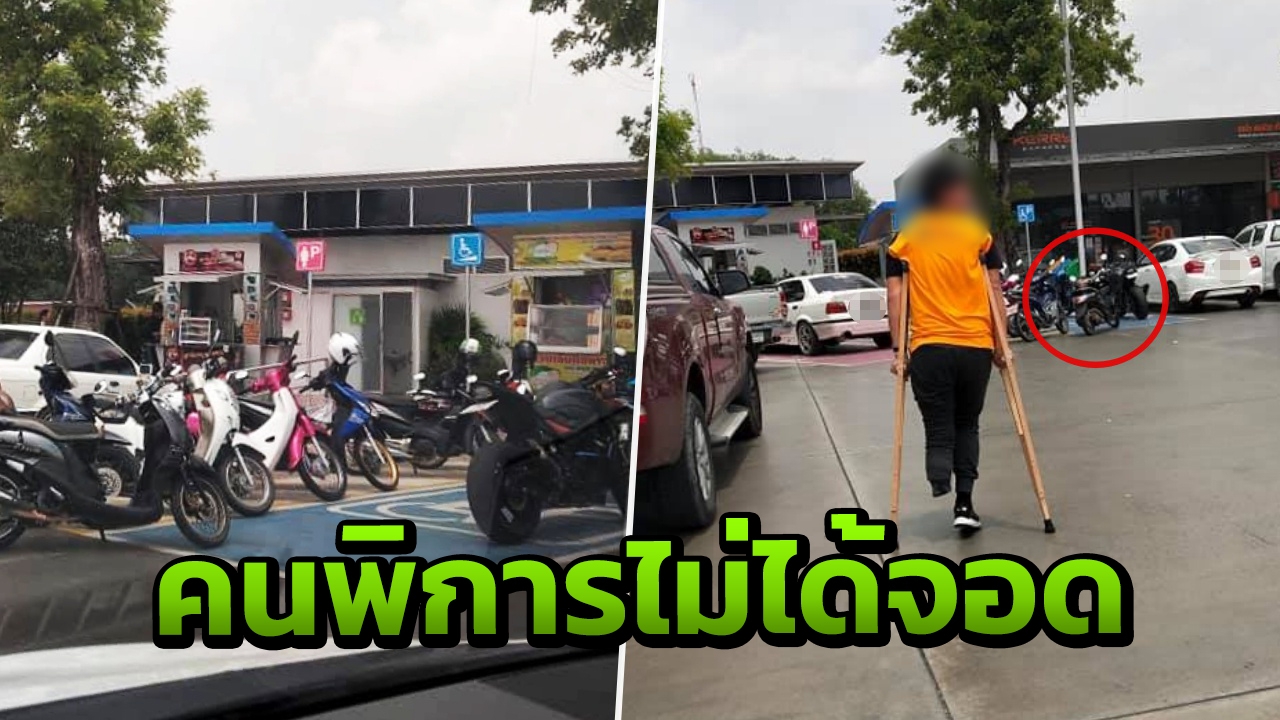 สาวโพสต์ภาพมอเตอร์ไซค์หลายคันจอดกินพื้นที่จอดของคนพิการ ทำให้แฟนหนุ่มที่ต้องใช้ไม้ค้ำพยุงร่างกายต้องเดินไกล