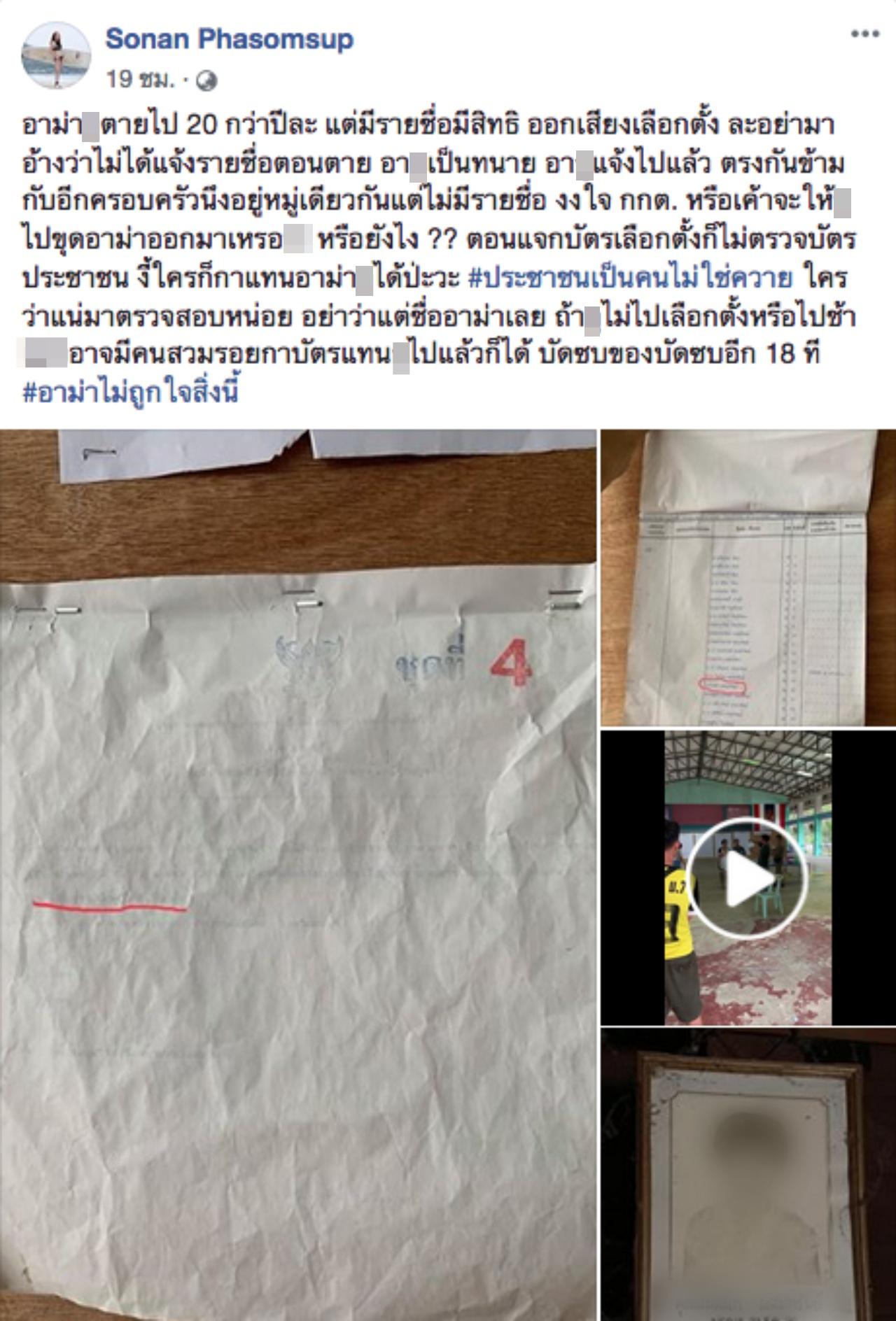 เฟซบุ๊ก Sonan Phasomsup โพสต์ภาพและข้อความอ้างว่า อาม่าตายไป 20 กว่าปี แต่มีรายชื่อมีสิทธิ ออกเสียงเลือกตั้ง ทั้งที่ตอนที่อาม่าเสียชีวิตได้มีการแจ้งไปแล้ว ตรงกันข้ามกับอีกครอบครัวหนึ่งอยู่หมู่เดียวกันแต่ไม่มีรายชื่อ งงใจ กกต.