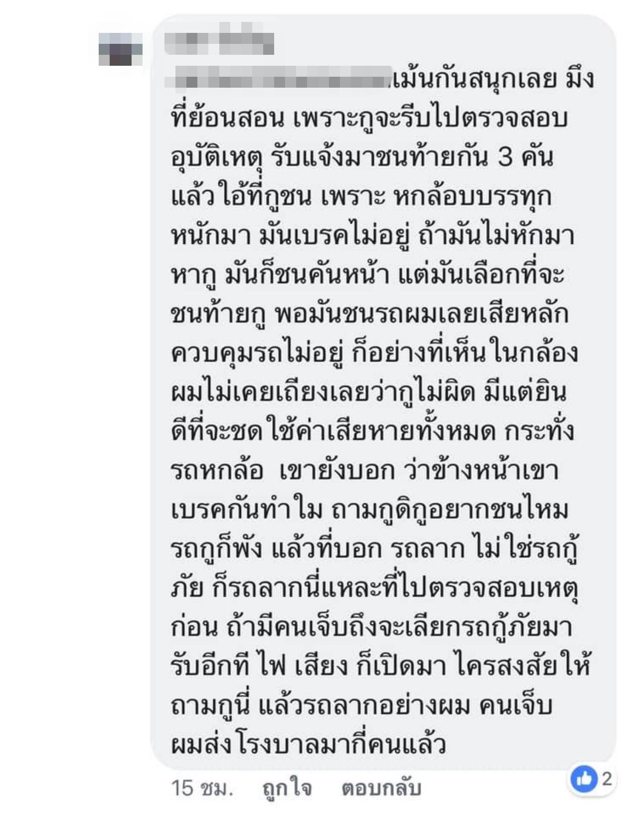 “ผมไม่เคยเถียงเลยว่าไม่ผิด มีแต่ยินดีที่จะชดใช้ค่าเสียหายทั้งหมด รถหกล้อเขายังบอกว่าข้างหน้าเขาเบรกกันทำไม ถามดิอยากชนไหม รถก็พัง แล้วที่บอกว่ารถลากไม่ใช่รถกู้ภัย ก็รถลากนี่แหละที่ไปตรวจสอบเหตุก่อน ถ้ามีคนเจ็บก็จะเรียกรถกู้ภัยมารับอีกที ไฟ เสียงก็เปิดมา ใครสงสัยให้ถาม แล้วรถลากอย่างผม คนเจ็บผมส่งโรงพยาบาลมากี่คนแล้ว”