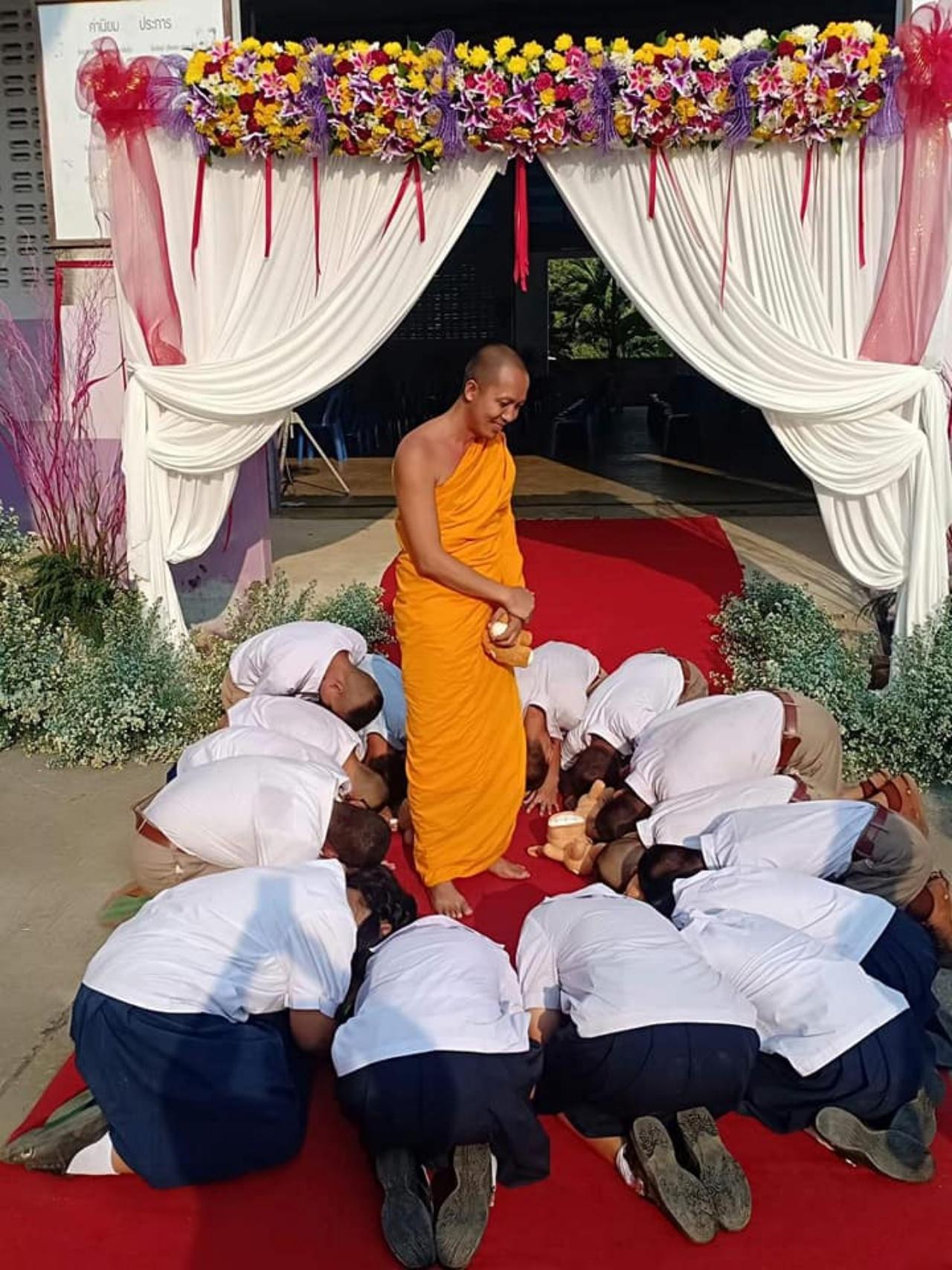 สำหรับภาพที่เห็นนี้เป็นภาพที่เด็กที่เรียนจบชั้นประถมศึกษาปีที่ 6 และกำลังเข้าศึกษาระดับชั้นมัธยมศึกษาปีที่ 1 ตัวอาตมาก็เลยไปที่โรงเรียน เพื่อแสดงความยินดีกับเด็กและนำตุ๊กตาไปมอบให้ ซึ่งเด็กได้แสดงออกถึงความกตัญญูโดยการก้มลงกราบอาตมา