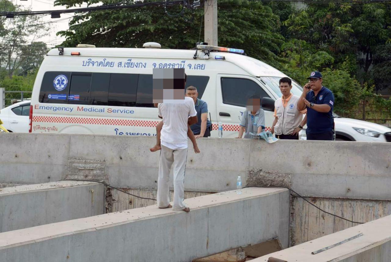 ไม่รู้จะอธิบายยังไง หนุ่มวัย 37 ปี อุ้มลูกชายวัยเพียง 3 ขวบ จะกระโดดคานอุโมงค์ลอดทางต่างระดับที่หนองคาย หลังน้อยใจภรรยาไม่ยอมกลับบ้าน ล่าสุดปลอดภัยแล้ว