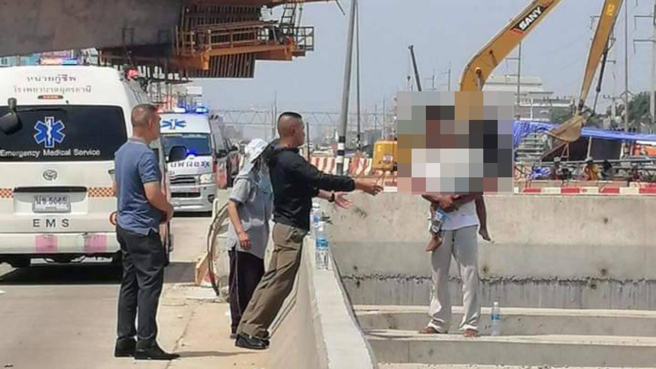 ทั้งนี้ ที่เกิดเหตุพบนายเอ (นามสมมติ) อายุ 37 ปี สวมเสื้อยืดสีขาว กางเกงขายาวผ้าร่มสีขาว ไม่สวมรองเท้า อุ้มลูกชายอายุ 3 ขวบ สวมหมวกไหมพรม ยืนอยู่บนคานอุโมงค์ซึ่งกำลังก่อสร้างยังไม่เสร็จ สูงประมาณ 10 เมตร ด้านล่างมีเศษเหล็ก อิฐ หิน อยู่จำนวนมาก ท่ามกลางอากาศที่ร้อนอบอ้าว โดยขู่ว่าจะอุ้มลูกกระโดดลงไปเพื่อฆ่าตัวตาย