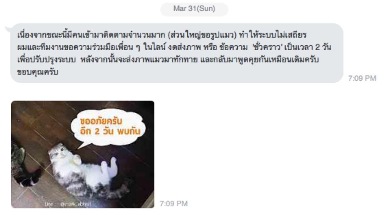 ทำให้วันที่ 31 มี.ค.62 นายอภิสิทธิ์ ได้ส่งข้อความแจ้งแฟนคลับว่า "เนื่องจากขณะนี้มีคนเข้ามาติดตามจำนวนมาก (ส่วนใหญ่ขอรูปแมว) ทำให้ระบบไม่เสถียร ผมและทีมงานขอความร่วมมือเพื่อนๆ ในไลน์ งดส่งภาพ หรือข้อความ 'ชั่วคราว' เป็นเวลา 2 วัน เพื่อปรับปรุงระบบ หลังจากนั้นจะส่งภาพแมวมาทักทาย และกลับมาพูดคุยกันเหมือนเดิมครับ ขอบคุณครับ"