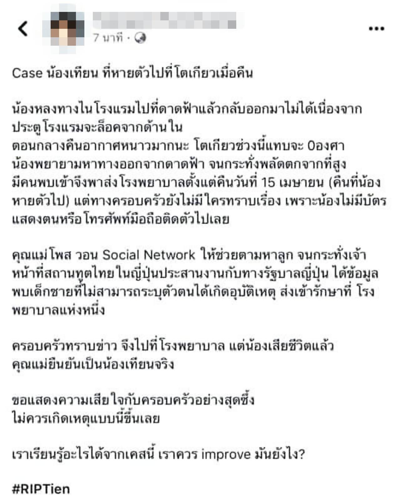 - เศร้า “น้องเธียรช์” เด็กชาย 14 หายตัวที่ญี่ปุ่น จากไปอย่างสงบด้วยอุบัติเหตุ