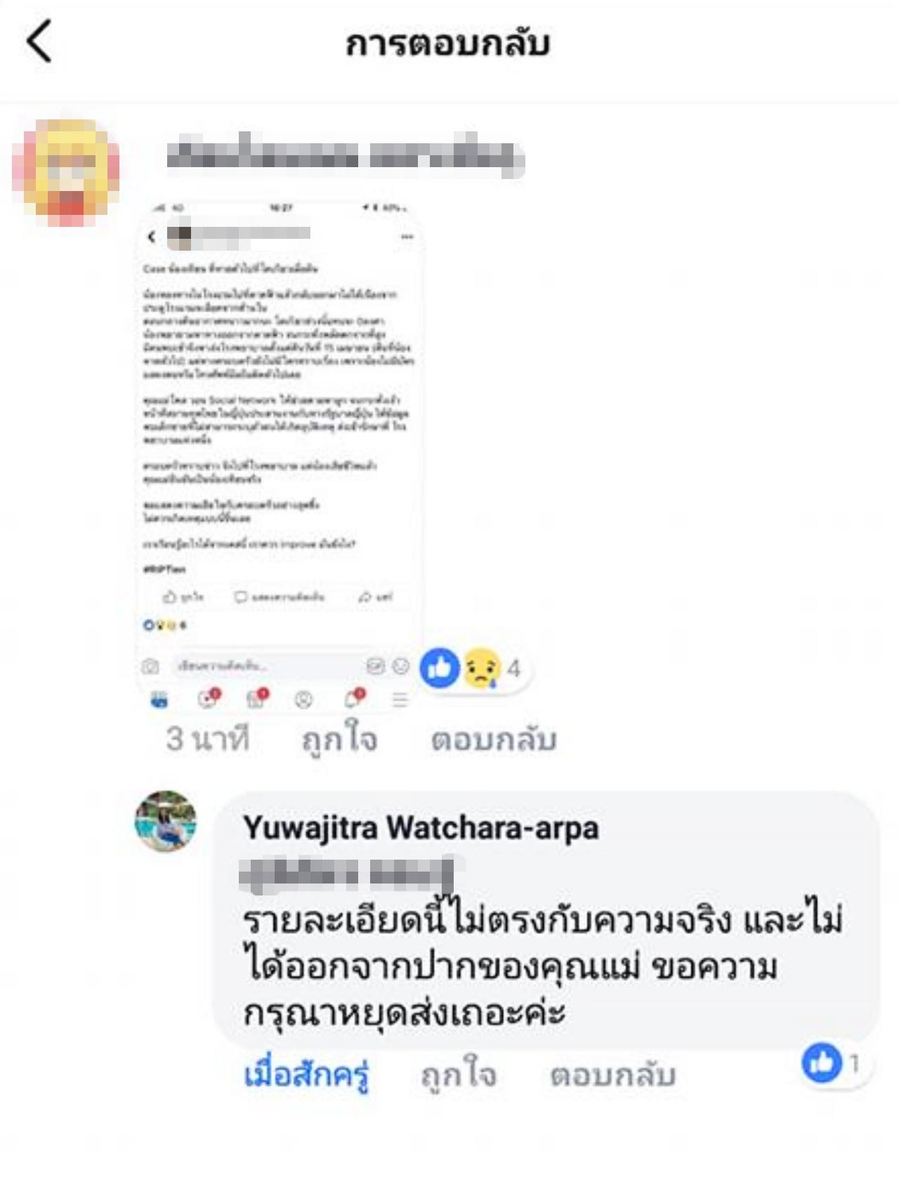 ทางด้านคุณแม่ของน้องเธียรช์ ได้มาตอบคอมเมนต์ที่มีผู้แคปเจอร์ภาพมาใส่ใต้โพสต์ว่า “รายละเอียดนี้ไม่ตรงกับความจริง และไม่ได้ออกจากปากคุณแม่ ขอความกรุณาหยุดส่งเถอะค่ะ”