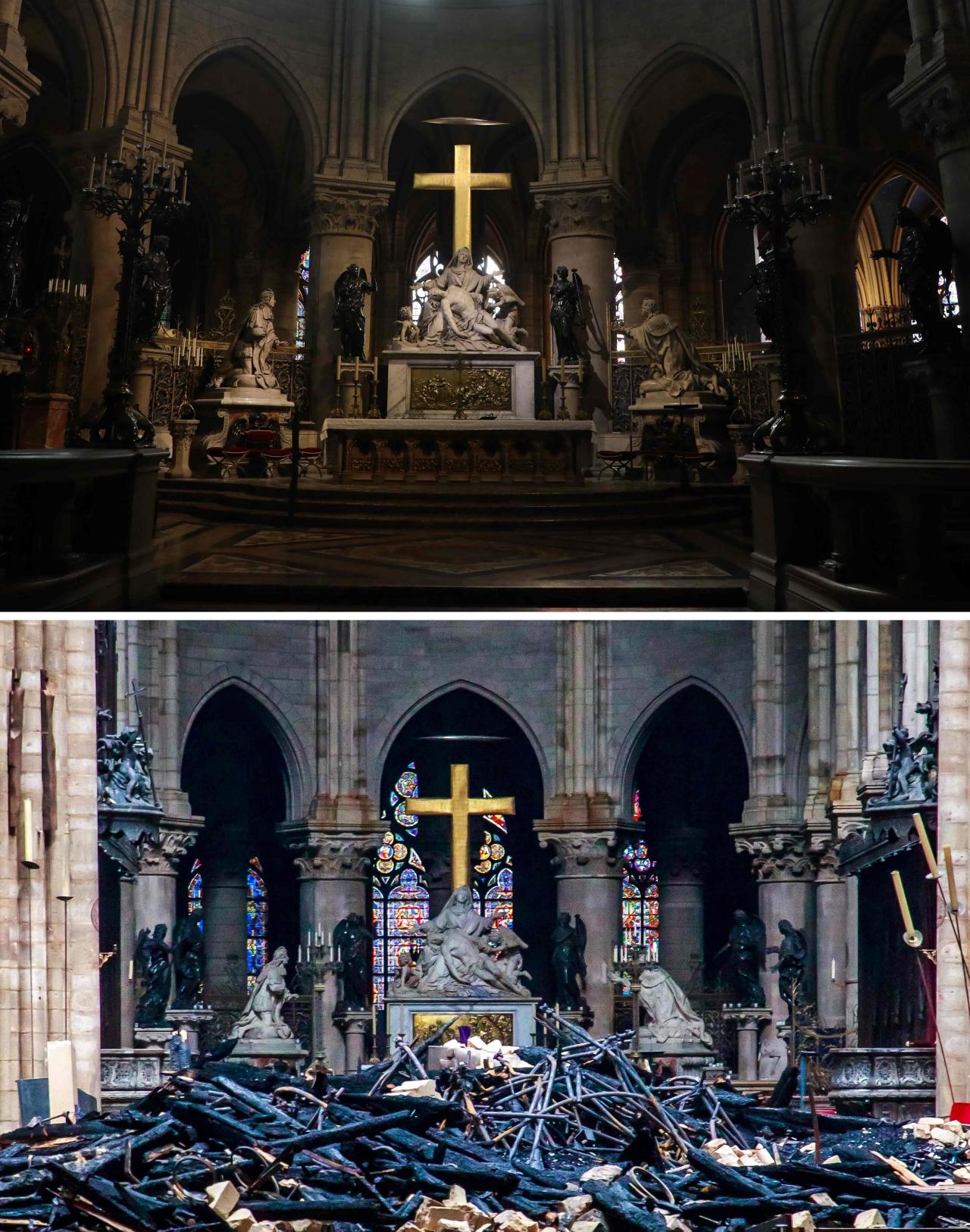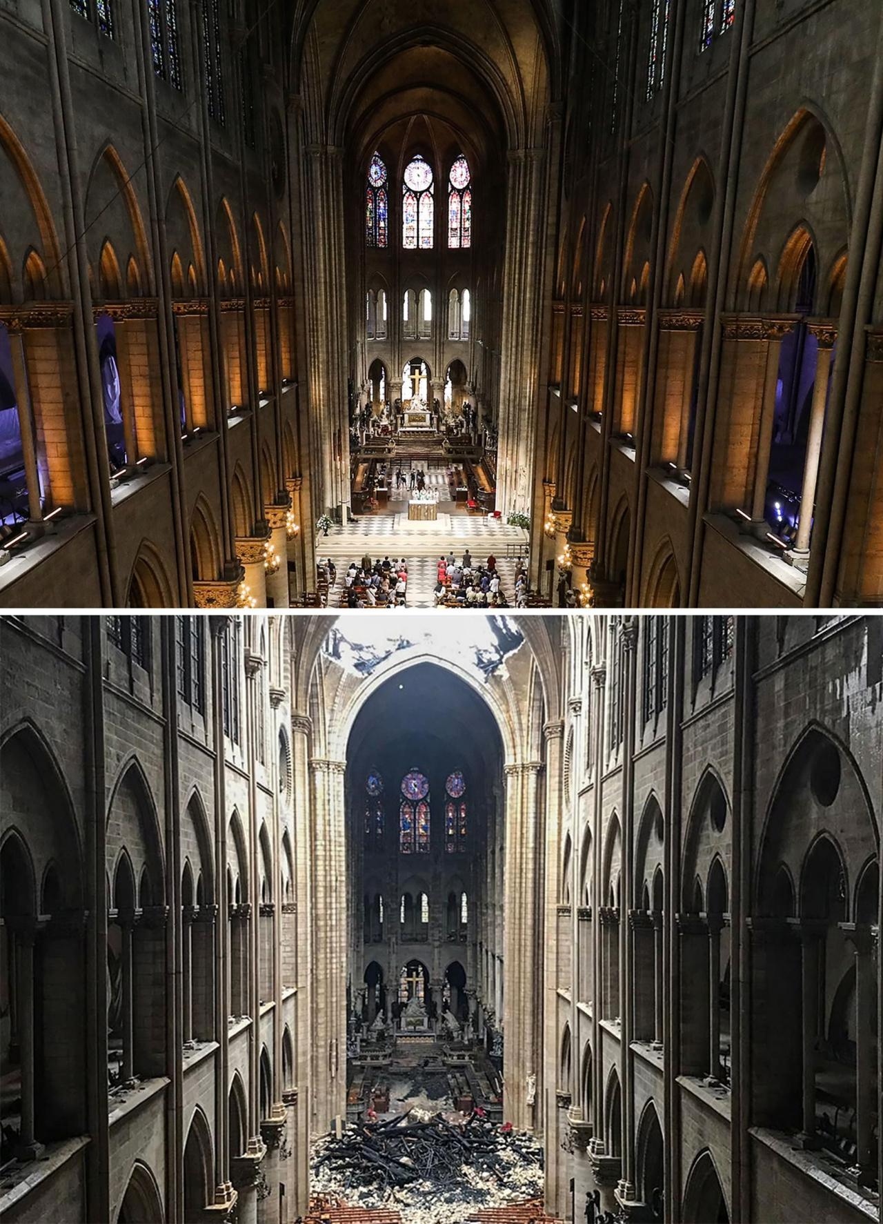 สำนักข่าวต่างประเทศ เผยภาพเปรียบเทียบภายในและนอก “มหาวิหารนอเทรอดาม” หลังไฟมอดดับ ต้องบูรณะครั้งใหญ่