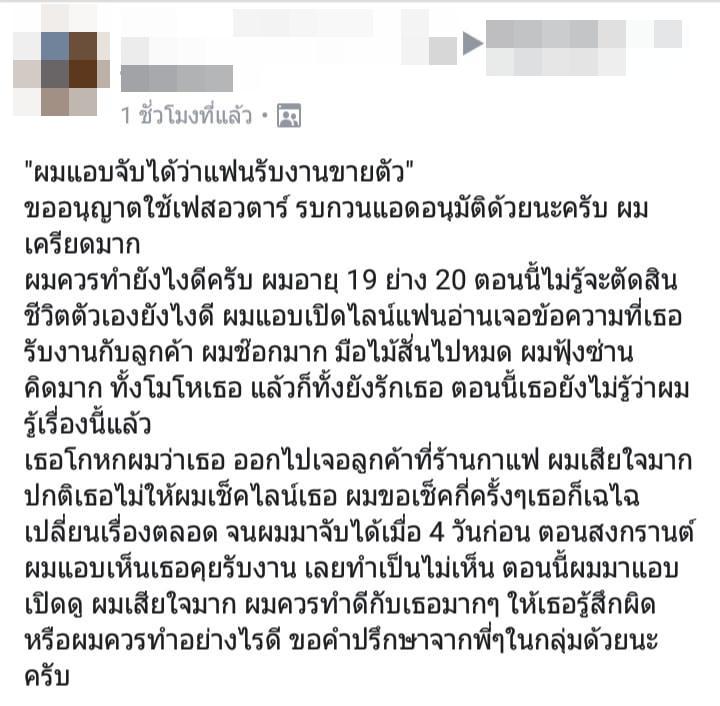 วันที่ 18 เม.ย.62 ผู้ใช้เฟซบุ๊กรายหนึ่งโพสต์ข้อความว่า "ผมแอบจับได้ว่าแฟนรับงานขายตัว" ผมควรทำยังไงดีครับ ผมอายุ 19 ย่าง 20 ตอนนี้ไม่รู้จะตัดสินชีวิตตัวเองยังไงดี ผมเปิดไลน์แฟนอ่านเจอข้อความที่เธอรับงานกับลูกค้า ผมช็อกมาก มือไม้สั่นไปหมด ผมฟุ้งซ่านคิดมาก ทั้งโมโหเธอ แล้วก็ยังรักเธอ ตอนนี้เธอยังไม่รู้ว่าผมรู้เรื่องนี้แล้ว