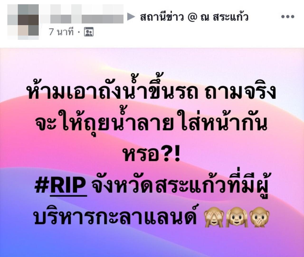 โลกออนไลน์ดราม่า หลังถูกห้ามเล่นน้ำทิ้งท้ายสงกรานต์วันไหลสระแก้ว ด้านรองผู้ว่าฯ เผยทางจังหวัดไม่ได้สั่งห้ามเล่นน้ำ แต่ขอความร่วมมือทุกคนสร้างภาพลักษณ์ที่ดีงาม...