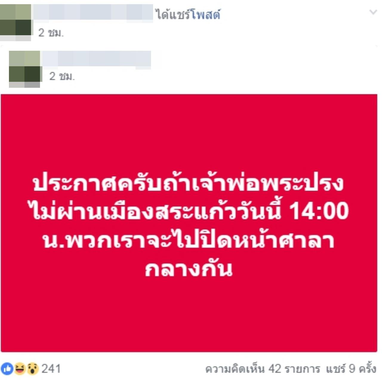 วันที่ 19 เม.ย. ผู้สื่อข่าวรายงานว่า ในโลกออนไลน์มีการโพสต์ถึงเรื่องการสั่งงดไม่ให้เล่นน้ำ ทิ้งท้ายประเพณีสงกรานต์ ในวันที่ 19 เมษายน ซึ่งคนจังหวัดสระแก้วได้เล่นกันต่อเนื่องมาหลายสิบปี เรียกว่าเป็นวันไหลสระแก้ว ที่ผ่านมาจะมีประชาชนออกมาเล่นน้ำจากคนในพื้นที่และคนพื้นที่ใกล้เคียง จำนวนหลายหมื่นคน