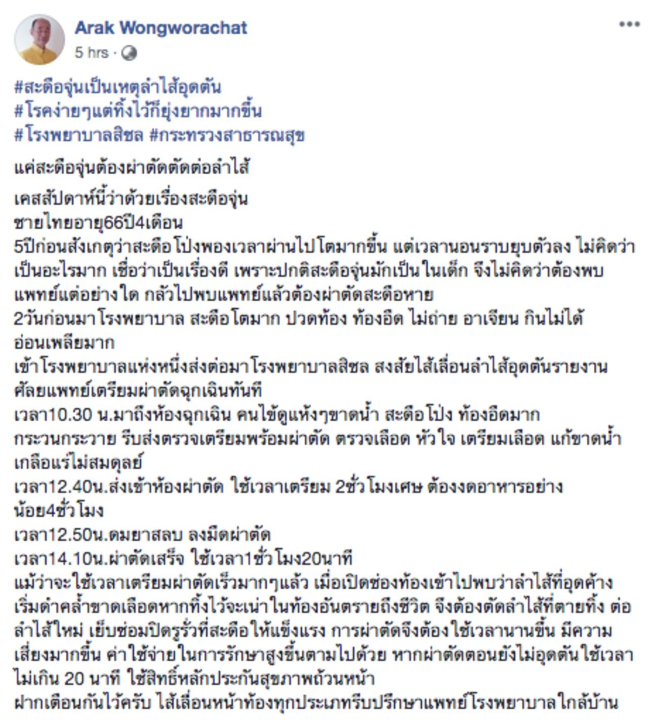 วันที่ 16 เม.ย.62 ผู้สื่อข่าวรายงานว่า นพ.อารักษ์ วงศ์วรชาติ ผู้อำนวยการโรงพยาบาลสิชล จ.นครศรีธรรมราช โพสต์เตือนกรณีคนไข้คิดว่าตัวเองสะดือจุ่น สุดท้ายพบเป็นลำไส้อุดตัน โดยเล่าว่า ชายไทยอายุ 66 ปี 4 เดือน เมื่อ 5 ปีก่อน สังเกตว่าสะดือโป่งพองเวลาผ่านไปโตมากขึ้น แต่เวลานอนราบยุบตัวลง ไม่คิดว่าเป็นอะไรมาก