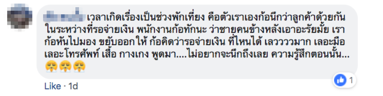 ทั้งนี้ ผู้เสียหายบอกในช่องแสดงความคิดเห็นใต้โพสต์ที่เธอนำไปโพสต์ลงกลุ่มสาธารณะด้วยว่า เหตุการณ์เกิดขึ้นในพื้นที่ อ.บางพลี จ.สมุทรปราการ เมื่อ 2 เดือนมาแล้ว แจ้งความแต่ยังไม่มีอะไรคืบหน้า จึงอยากจะเตือนภัยเรื่องที่เจอกับตัวเอง โดยเวลาเกิดเรื่องเป็นช่วงพักเที่ยง ตอนแรกนึกว่าลูกค้าด้วยกัน ในระหว่างที่รอจ่ายเงินพนักงานก็ทักว่าผู้ชายคนข้างหลังเอาอะไรไหม จึงหันไปมองแล้วขยับออกให้ ไม่คิดว่าจะทำแบบนี้