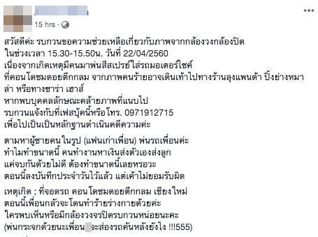 ทั้งนี้เจ้าของโพสต์ ระบุอีกว่า ตอนนี้รู้สึกพะวงและกลัวจะโดนทำร้ายร่างกายเนื่องจากมีการสนทนาผ่านเฟซบุ๊ก จากผู้ต้องสงสัยใช้คำสนทนาหมิ่นประมาทและคล้ายข่มขู่ ใครพบเห็นบุคคลลักษณะตามภาพหรือภาพจากกล้องวงจรปิด รบกวนแจ้งหรือส่งข้อมูลมาใน ib/fb ได้เลยนะคะ