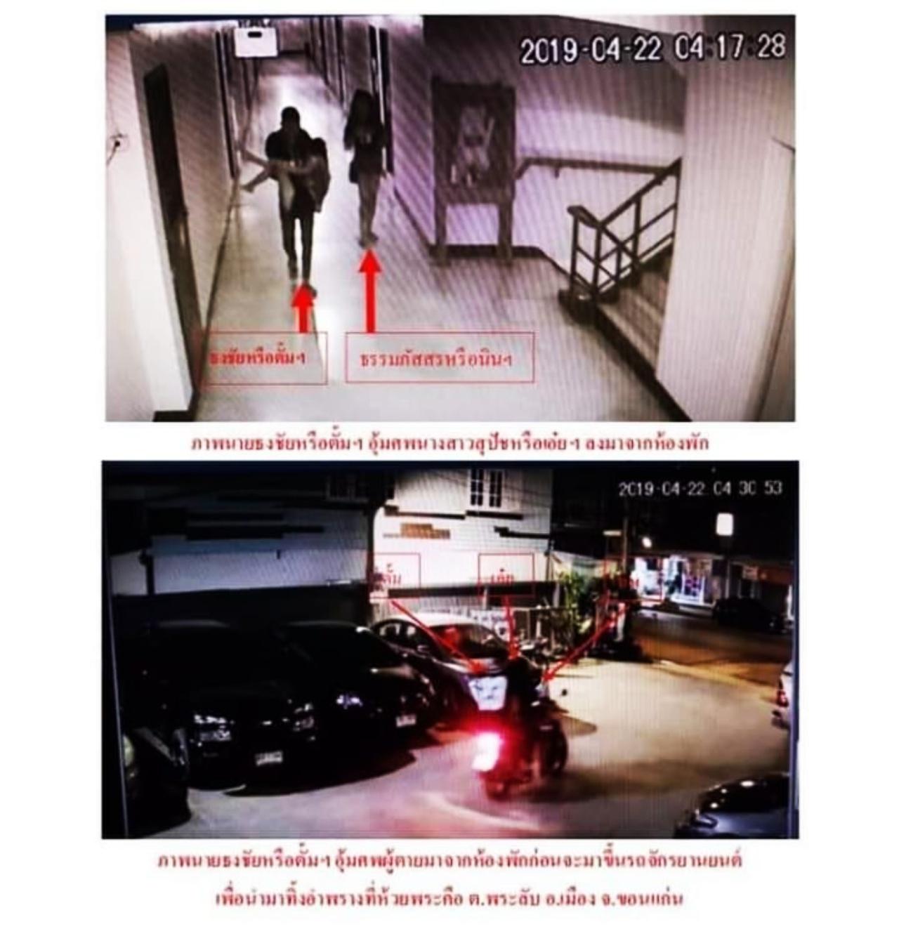 ทั้งนี้ก่อนที่ ตั้ม ไส้แตก จะถูกจับกุมนั้น ในโลกโซเชียลมีการเผยแพร่ภาพจากกล้องวงจรปิดให้เห็นชายคนหนึ่งอุ้มผู้หญิง และมีผู้หญิงอีกคนเดินอยู่ข้างกัน เป็นเหตุการณ์เมื่อเวลา 04.17 น. วันที่ 22 เม.ย. 2562 ที่ผ่านมา โดยในภาพมีการระบุว่าผู้ชายคือ ตั้ม ไส้แตก กำลังอุ้มศพน้องเอ๋ย ส่วนผู้หญิงที่เดินมาด้วยกันคือ น.ส.ธรรมภัสสร พุทธรักษา ส่วนอีกภาพเป็นตอนที่ ตั้ม ไส้แตก และ น.ส.ธรรมภัสสร นำศพน้องเอ๋ย ขึ้นรถจักรยานยนต์ในลักษณะซ้อนสาม ก่อนจะนำไปทิ้งอำพรางที่ห้วยพระคือ ต.พระลับ อ.เมืองขอนแก่น