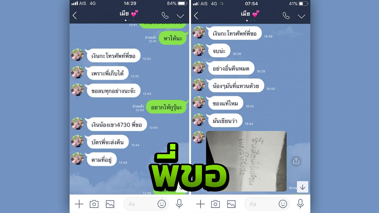 ซึ่งในแชตเป็นข้อความสนทนา กับผู้หญิงคนหนึ่ง ที่เก็บโทรศัพท์มือถือของภรรยาเจ้าของโพสต์ได้ และว่า จะคืนเอกสารให้ แต่โทรศัพท์ และเงิน 4,730 บาท ขอเก็บไว้ เพราะตัวเองเป็นคนเก็บได้ แม้ว่าโทรศัพท์จะแตกก็ตาม ก็จะนำไปซ่อม และเก็บไว้ใช้เอง โดยขอลบทุกอย่าง และนำเอกสารที่เหลือส่งคืนตามที่อยู่ในบัตรประชาชน