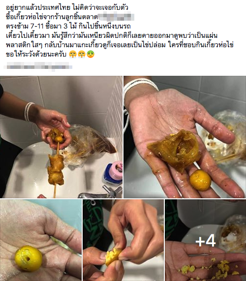 จากกรณีมีการแชร์โพสต์เรื่อง “ไข่ปลอม” โดยต้นโพสต์ได้ระบุข้อความว่า “อยู่ยากแล้วประเทศไทย ไม่คิดว่าจะเจอกับตัว ซื้อเกี๊ยวห่อไข่จากร้านลูกชิ้นตลาด... ตรงข้าม 7-11 ซื้อมา 3 ไม้ กินไปชิ้นหนึ่งบนรถ เคี้ยวไปเคี้ยวมา มันรู้สึกว่ามันเหนียวผิดปกติก็เลยคายออกมาดูพบว่าเป็นแผ่นพลาสติกใสๆ กลับบ้านมาแกะเกี๊ยวดูก็เจอเลยเป็นไข่ปลอม ใครที่ชอบกินเกี๊ยวห่อไข่ ขอให้ระวังด้วยนะครับ” ก่อนที่เจ้าของโพสต์จะลบเรื่องดังกล่าวออกไป แต่ก็มีผู้ใช้เฟซบุ๊กรายอื่นแคปเจอร์ไว้และบางส่วนนำมาโพสต์ต่อ