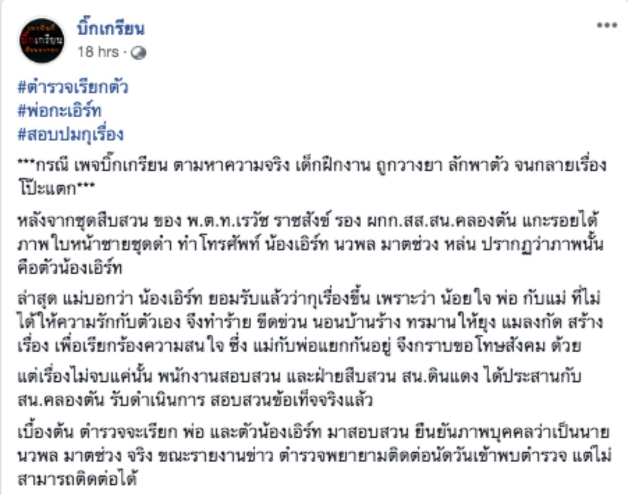 ต่อมาวันที่ 25 เม.ย.62 แฟนเพจ บิ๊กเกรียน อ้างว่า แม่ของน้องเอิร์ธ ยอมรับแล้วว่าลูกชายกุเรื่องขึ้นเพราะน้อยใจพ่อแม่ที่ไม่ให้ความรักกับตัวเอง จึงทำร้ายขีดข่วน นอนบ้านร้าง ทรมานตัวเองให้ยุงกัด สร้างเรื่องเพื่อเรียกร้องความสนใจ