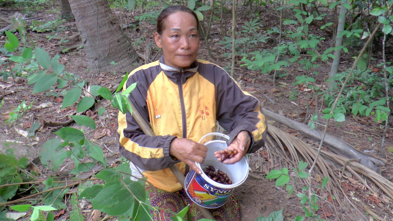 ยายหรั่ง หรือ นางพิญดา บุตรศรี อายุ 50 ปี ชาวบ้าน ต.ดงมะไฟ อ.เมือง จ.สกลนคร จะใช้เวลาวันละ 1 ชั่วโมง ถือเสียมมือและถังใบเล็กๆ ตระเวนไปที่ป่าละเมาะข้างบ้าน เพื่อขุดหาอาหารโดยอาหารที่ขุดหา คือ แมงจีนูน หรือ แมงขนุนใหญ่