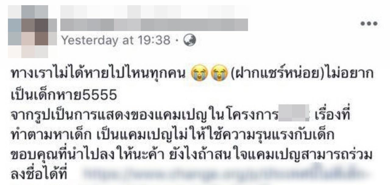 ทั้งนี้ทางเพจ ระบุเพิ่มเติมว่า เป็นแคมเปญที่สิ้นคิดมาก เมื่อสักสองสามวันแชร์บอกว่าเด็กหาย คนก็ช่วยกันแชร์เป็นห่วงกันใหญ่ แต่เมื่อวานออกมาโพสต์ว่าเป็นแคมเปญอะไรสักอย่าง ต่อไปถ้ามีคนหายจริงๆ ใครจะช่วย แฟนน้องที่ทำงานเคืองมาก คอยถามต้นทางว่าเจอยังเจองี้เฟลเลย น้องคือเป็นห่วงมากอุตส่าห์ช่วยแล้วมาเจอแบบนี้