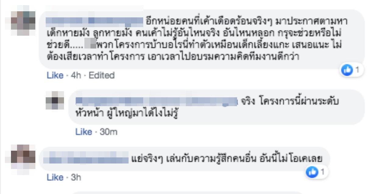 เช่นเดียวกับผู้ใช้เฟซบุ๊กรายหนึ่งที่ได้ช่วยแชร์ประกาศตามหาคนหาย ระบุเพิ่มเติมว่า เป็นการตลาดที่รู้สึกถึงความห่วยแตกมากค่ะ เอาความรู้สึกของคนอื่นเป็นเครื่องมือทางการตลาด โครงการดี ควรทำการตลาดให้ดีมากกว่านี้ ถึงกับเรียกคนที่ถือใบปลิวมาบอกแนะนำว่าไปประกาศทางช่องทางนู่นนี่นั่นสิ