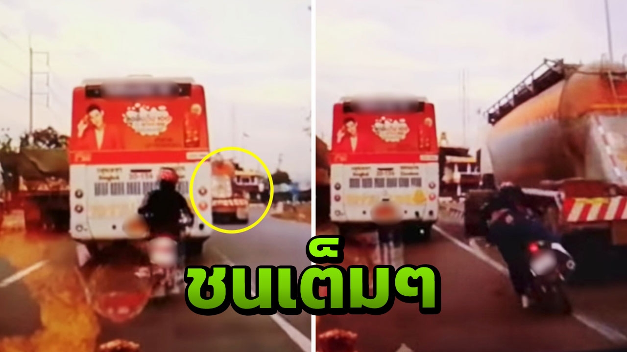 เพจเฮีย โพสต์คลิปกล้องหน้ารถ จับภาพนาทีมอเตอร์ไซค์ออกขวาพยายามแซงรถโดยสาร สุดท้ายชนท้ายพ่วงกำลังชะลอกลับรถ ซ้ำถูกรถตามหลังชน