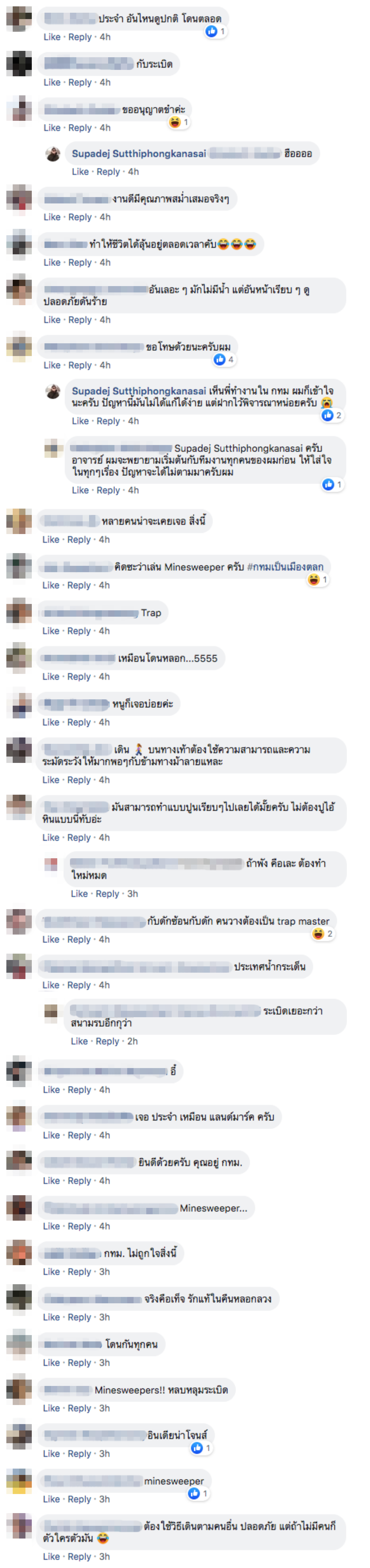 ทั้งนี้ โพสต์ของ อ.ศุภเดช ผู้ใช้เฟซบุ๊กจำนวนมากเข้ามาแสดงความคิดเห็น ส่วนใหญ่บอกเล่าประสบการณ์ที่เคยเจอในลักษณะนี้เช่นกัน พร้อมเรียกทางเท้าที่มีน้ำขังทุกครั้งที่ฝนตกว่า “กับระเบิด” ถึงแม้จะพยายามหลีกเลี่ยงและคาดเดาไปเหยียบบนแผ่นที่คิดจะไม่มีน้ำ แต่ก็ต้องเกมโอเวอร์เพราะกับระเบิดจนได้.