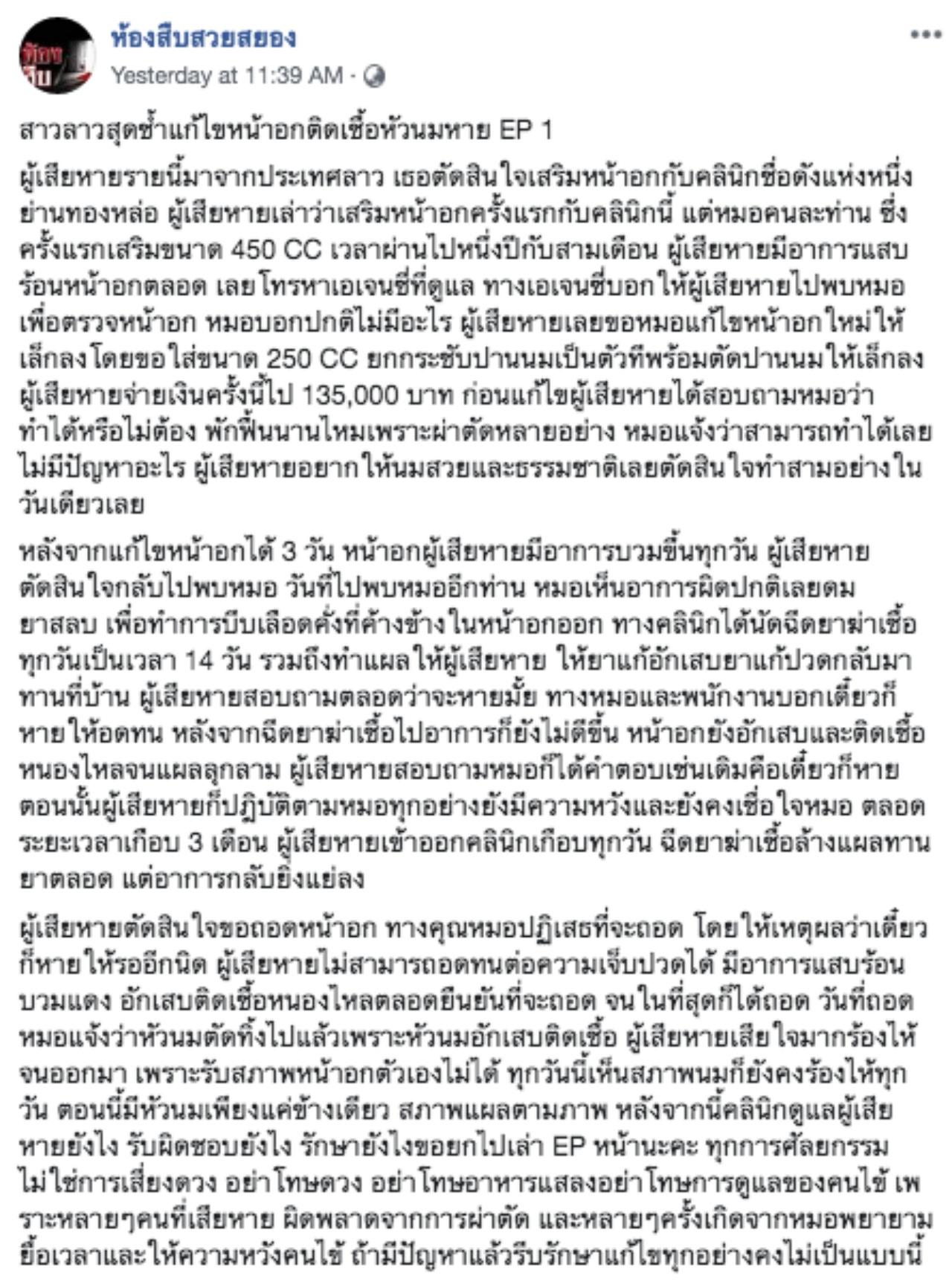 วันที่ 15 พ.ค.62 แฟนเพจ ห้องสืบสวยสยอง โพสต์อุทาหรณ์เตือนภัยว่า ผู้เสียหายรายนี้มาจากประเทศลาว ตัดสินใจเสริมหน้าอกกับคลินิกชื่อดังแห่งหนึ่งย่านทองหล่อ ครั้งแรกเสริมขนาด 450 CC ผ่านไป 1 ปีกับ 3 เดือน มีอาการแสบร้อนหน้าอกตลอด จึงแก้ไขหน้าอกใหม่ให้เล็กลง โดยขอใส่ขนาด 250 CC ยกกระชับปานนมเป็นตัวที พร้อมตัดปานนมให้เล็กลง จ่ายเงินไป 135,000 บาท