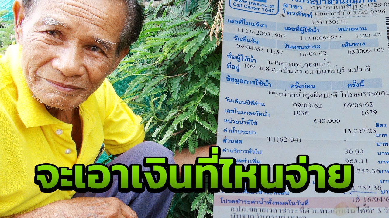 วันที่ 16 พฤษภาคม 62 ผู้สื่อข่าวได้การร้องเรียนและขอความเป็นธรรมจาก นายคำพอง กองแก้ว อายุ 84 ปี ชาว อ.กบินทร์บุรี จ.ปราจีนบุรี ว่า ค่าน้ำประปาที่เคยใช้ประมาณเดือนละไม่เกิน 200 บาท ใช้มานานเกือบ 10 ปี จู่ๆ ค่าน้ำประปาพุ่งพรวดเกือบ 15,000 บาท ทั้งๆ ที่ บ้านมีอยู่กันแค่ 2 คนกับภรรยา มีรายได้เพียงเงินผู้สูงอายุ และเก็บผักเล็กๆ น้อยๆ ขายในตลาด เพื่อเลี้ยงชีพ แถมถูกประปาบอก ถ้าไม่จ่าย จะฟ้องและตัดมิเตอร์ ทำให้ตัวเองเครียดจนไม่มีทางออก