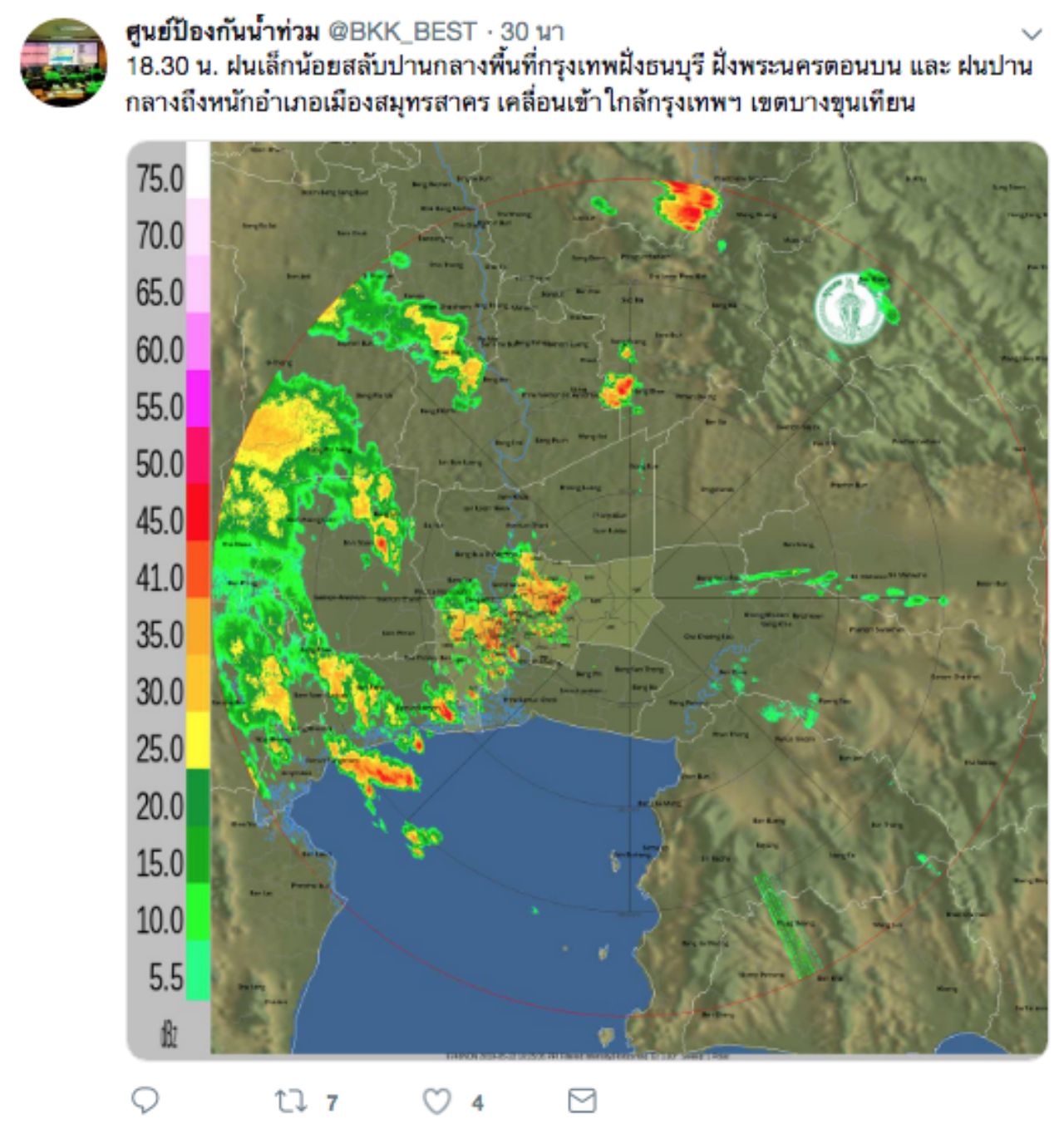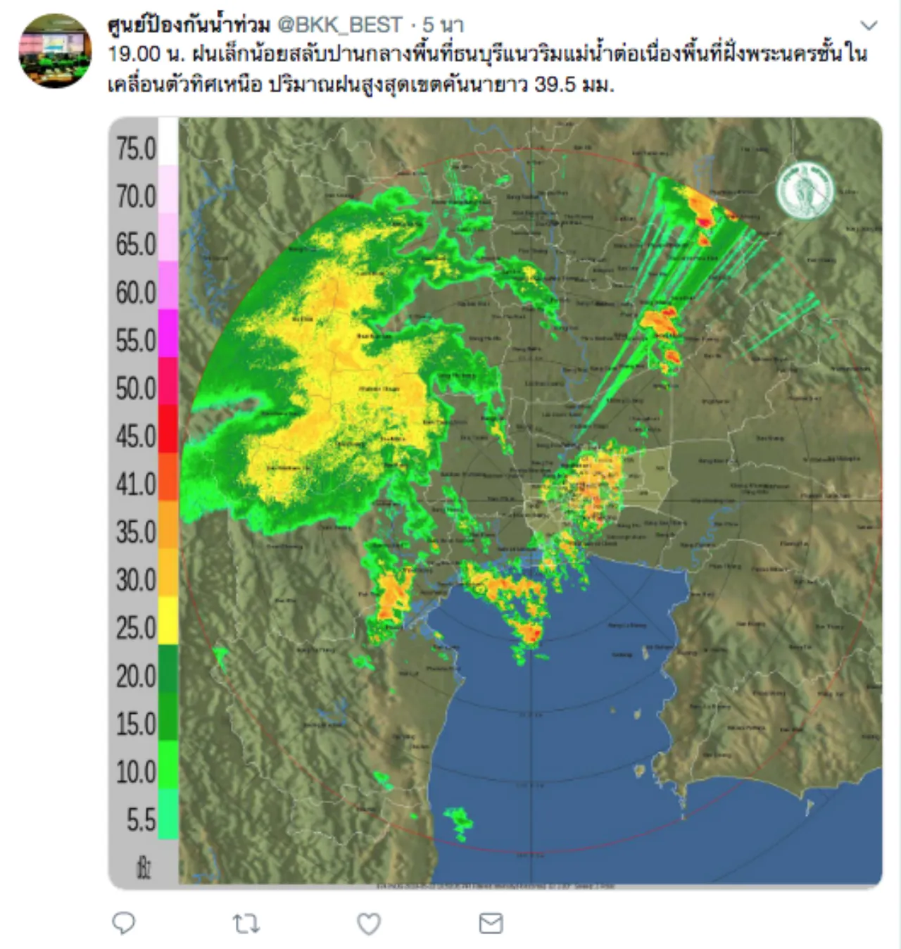 วันที่ 22 พ.ค.62 ศูนย์ป้องกันน้ำท่วม กทม. รายงานสภาพอากาศพื้นที่กรุงเทพมหานคร เมื่อเวลา 19.00 น. ฝนเล็กน้อยสลับปานกลางพื้นที่ธนบุรีแนวริมแม่น้ำ ต่อเนื่องพื้นที่ฝั่งพระนครชั้นใน เคลื่อนตัวทิศเหนือ ปริมาณฝนสูงสุดเขตคันนายาว 39.5 มม.
