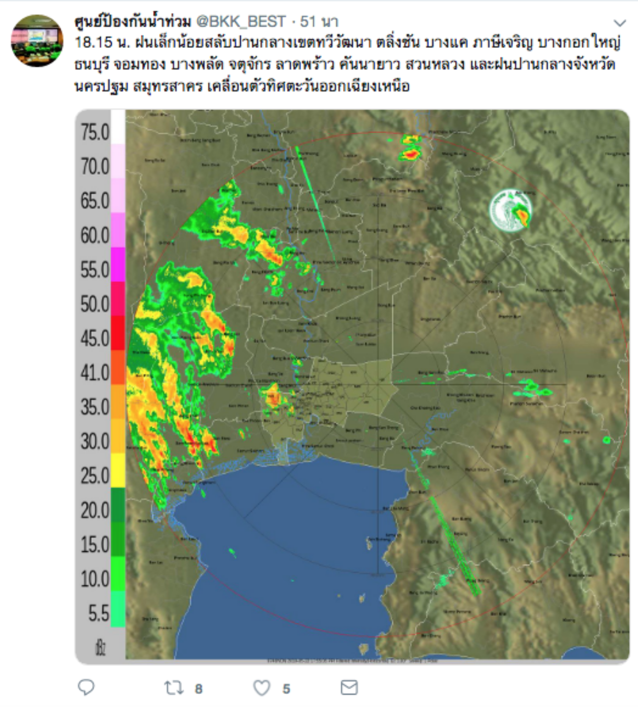 18.15 น. ฝนเล็กน้อยสลับปานกลาง เขตทวีวัฒนา ตลิ่งชัน บางแค ภาษีเจริญ บางกอกใหญ่ ธนบุรี จอมทอง บางพลัด จตุจักร ลาดพร้าว คันนายาว สวนหลวง และฝนปานกลาง จังหวัดนครปฐม สมุทรสาคร เคลื่อนตัวทิศตะวันออกเฉียงเหนือ