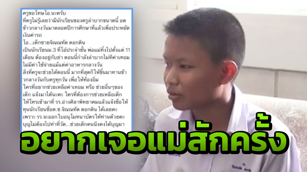 จากกรณีที่มีผู้ใช้เฟซบุ๊ก ชื่อ Thanunya Supasri ได้โพสต์ข้อความ “ครูขอโทษโอ นะครับ ที่ครูไม่รู้เลยว่ามีนักเรียนของครูลำบากขนาดนี้ อดข้าวกลางวันมาตลอดปีการศึกษาที่แล้วเพื่อประหยัดเงินค่ารถโอ...เด็กชายจิณณทัต ดอกดิน เป็นนักเรียน ม.3 ที่โอ๋ประจำชั้น พ่อแม่ทิ้งไปตั้งแต่ 11 เดือน ต้องอยู่กับย่า ตอนนี้กำลังลำบากไม่มีค่าเทอม ไม่มีค่าใช้จ่ายแม้แต่ค่าอาหารกลางวัน สิ่งที่ครูจะช่วยได้ตอนนี้ มากที่สุดก็ให้ขึ้นมาทานข้าวกลางวันกับครูทุกวัน เพื่อให้ท้องอิ่ม ใครที่อยากช่วยเหลือค่าเทอม หรือ ช่วยอื่นๆของเด็ก แจ้งมาได้นะคะ ใครที่ต้องการช่วยเหลือเด็ก ให้โทรเข้ามาที่ ร.ร.อ่างศิลาพิทยาคมแล้วแจ้งชื่อให้ทุนนักเรียนชื่อ ด.ช.จิณณทัต ดอกดิน ได้เลยค่ะ เพราะ ร.ร.จะออกใบอนุโมทนาบัตรให้ท่านด้วยค่ะ บุญไม่ต้องไปทำที่วัด...ช่วยเด็กคนนึงคงได้บุญมากมาย"