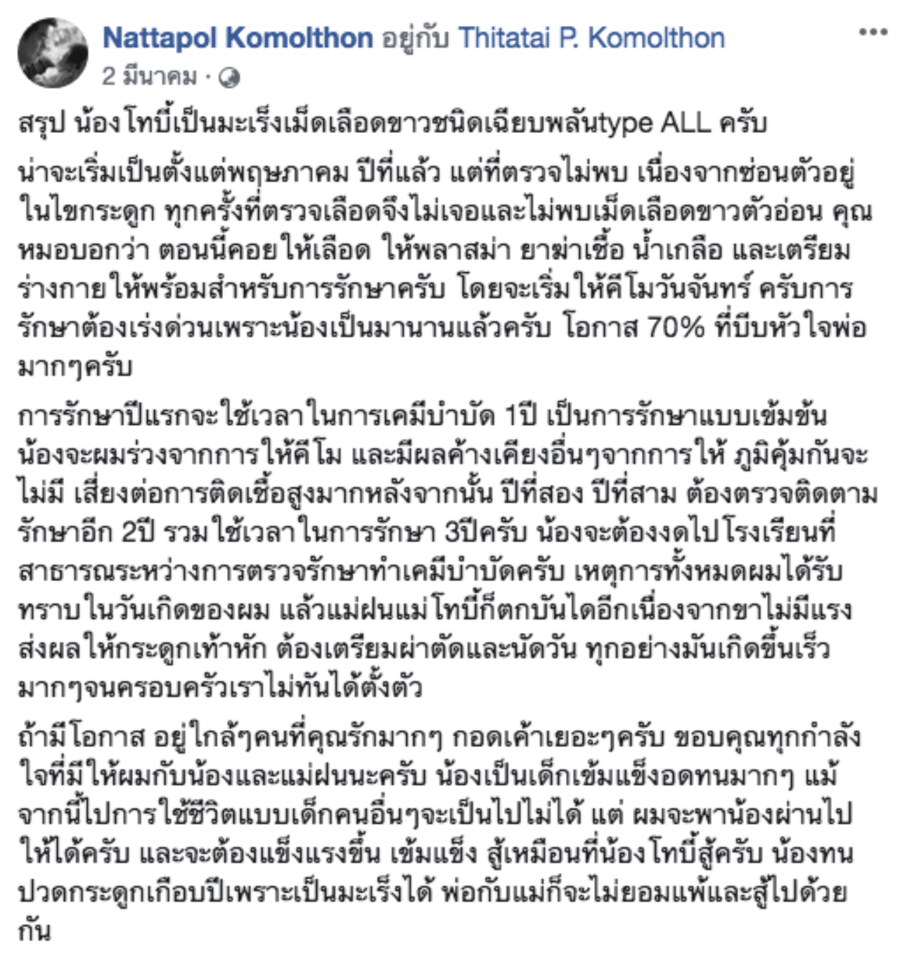 ผู้ใช้เฟซบุ๊ก Nattapol Komolthon โพสต์เรื่องราว ลูกน้อยวัย 5 ขวบ ชื่อว่า น้องโทบี้ ป่วยเป็นมะเร็งเม็ดเลือดขาวชนิดเฉียบพลัน ซึ่งใน 1 แสนคน จะมีคนป่วยประมาณ 3 คน ซึ่งอัตราการรักษาให้หายได้อยู่ที่ 70% ใช้เวลาต่อเนื่องยาวนานถึง 3 ปี น้องจำเป็นต้องหยุดเรียนหนังสือ และทำเคมีบำบัดอย่างเร่งด่วนตั้งแต่ช่วงเดือน มี.ค.ที่ผ่านมา จึงทำริสแบนด์ขาย เพื่อหาเงินช่วยน้องโทบี้ โดยมีชาวเน็ตร่วมช่วยสมทบทุนค่ารักษาน้องเป็นจำนวนมาก