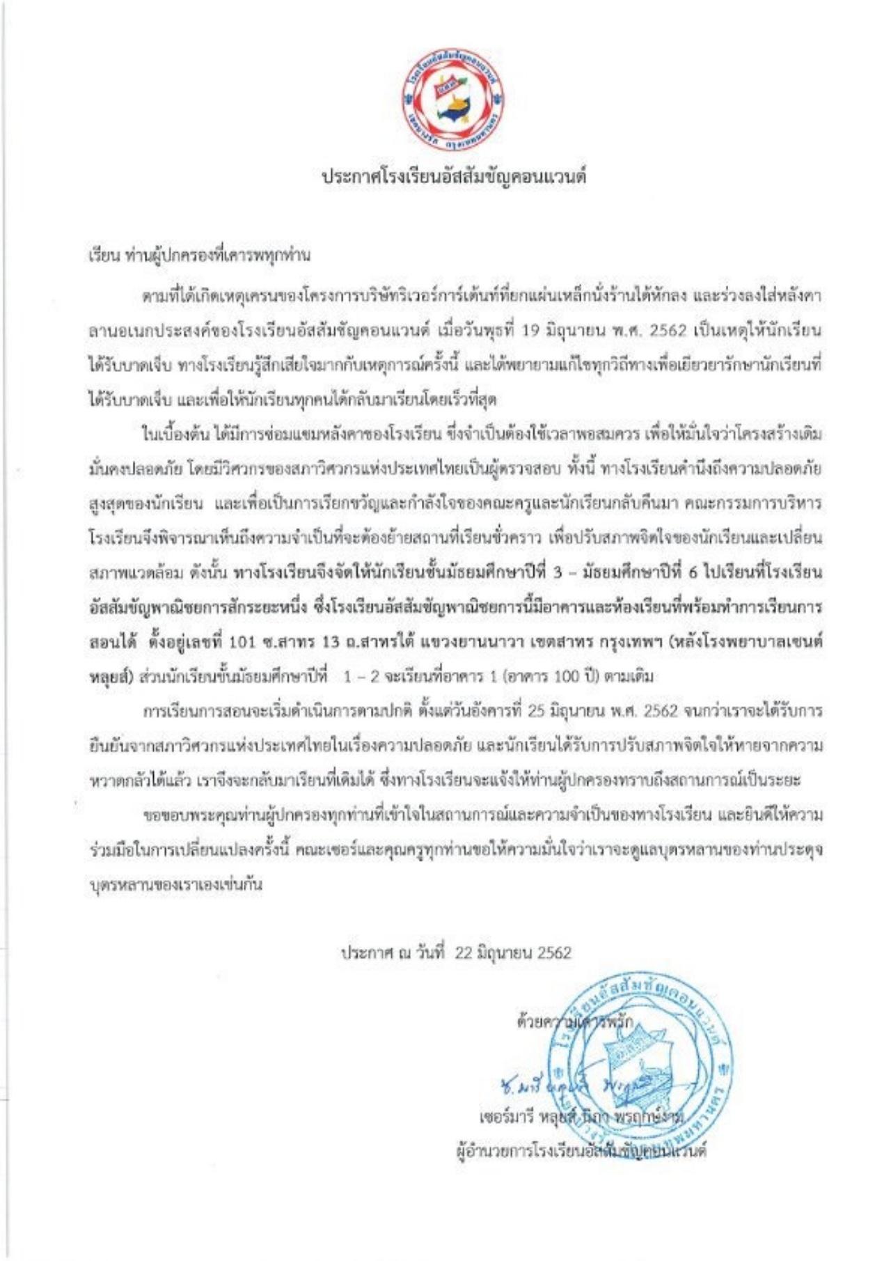 โรงเรียนอัสสัมชัญคอนแวนต์ ประกาศย้ายที่เรียนชั่วคราว เพื่อปรับสภาพจิตใจนักเรียน พร้อมเริ่มเปิดการเรียนวันที่ 25 มิ.ย.เป็นต้นไป