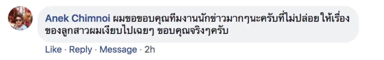 อย่างไรก็ตาม วันนี้พบว่า นายเอนก พ่อของผู้เสียชีวิตในคดีดังกล่าว ได้เข้ามาโพสต์ข้อความแสดงความคิดเห็นขอบคุณทีมข่าวไทยรัฐออนไลน์ด้วยว่า “ผมขอขอบคุณทีมงานนักข่าวมากๆ นะครับที่ไม่ปล่อยให้เรื่องของลูกสาวผมเงียบไปเฉยๆ ขอบคุณจริงๆ ครับ”