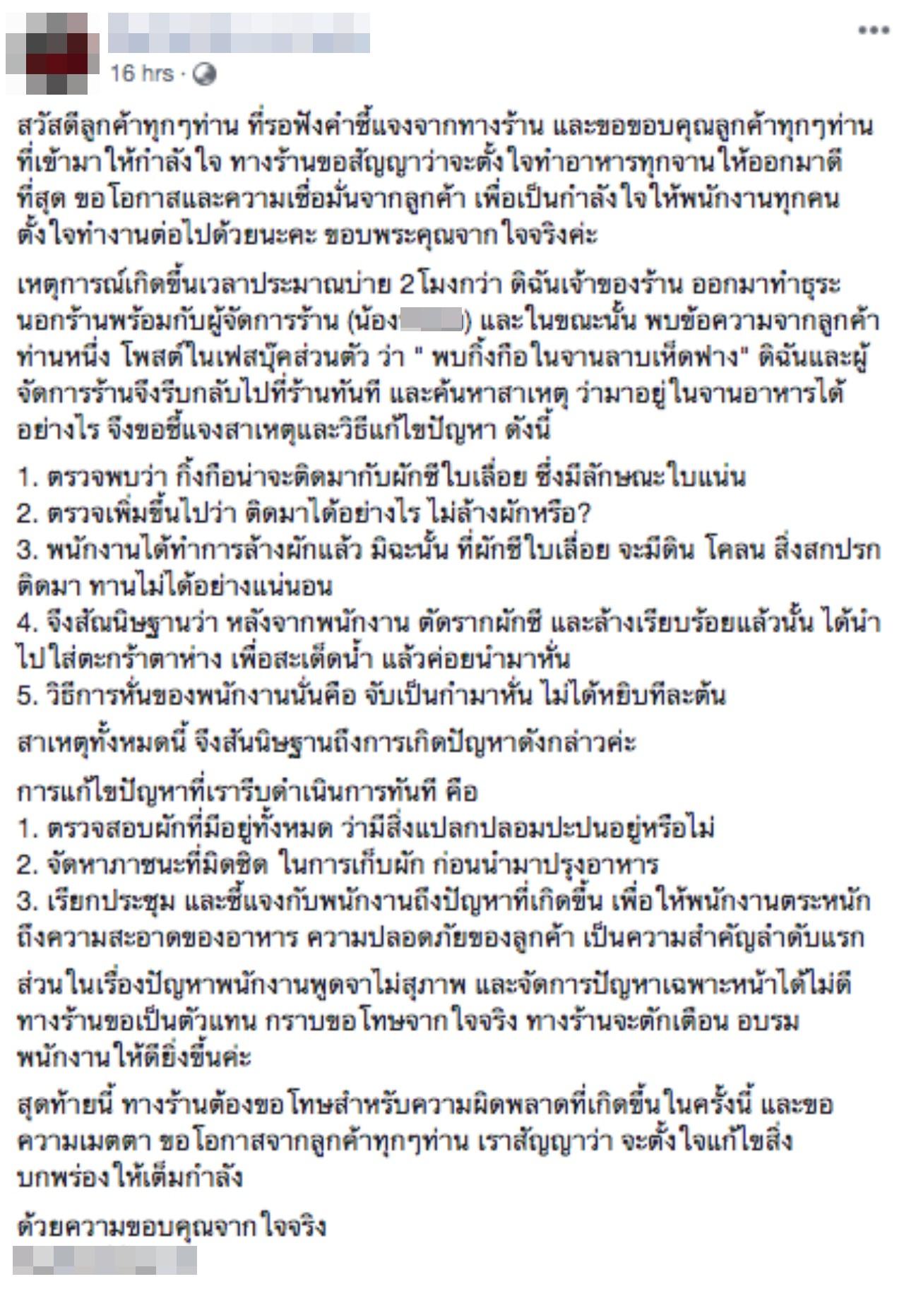 ส่วนในเรื่องปัญหาพนักงานพูดจาไม่สุภาพ และจัดการปัญหาเฉพาะหน้าได้ไม่ดี ทางร้านขอเป็นตัวแทน กราบขอโทษจากใจจริง ทางร้านจะตักเตือน อบรม พนักงานให้ดียิ่งขึ้น สุดท้ายนี้ ทางร้านต้องขอโทษสำหรับความผิดพลาดที่เกิดขึ้นในครั้งนี้ และขอความเมตตา ขอโอกาสจากลูกค้าทุกๆ ท่าน เราสัญญาว่าจะตั้งใจแก้ไขสิ่งบกพร่องให้เต็มกำลัง