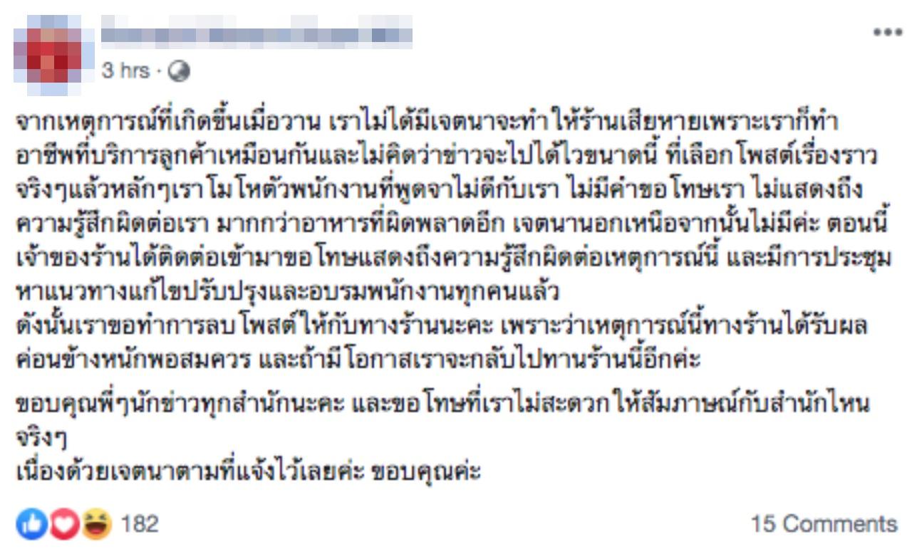 ต่อมาพบว่า สาวเจ้าของโพสต์ได้ลบโพสต์ดังกล่าวแล้ว พร้อมกับระบุว่า จากเหตุการณ์ที่เกิดขึ้นไม่ได้มีเจตนาทำให้ร้านเสียหาย และตอนนี้ทางร้านได้ติดต่อเข้ามาขอโทษแล้ว.