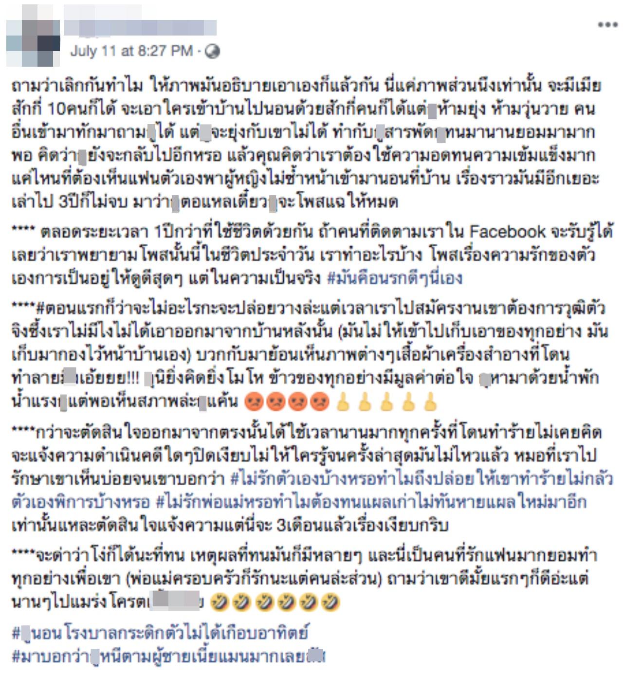 วันที่ 13 ก.ค.62 ผู้ใช้เฟซบุ๊กสาวรายหนึ่ง เล่าประสบการณ์ความรักของตัวเองเพื่อเป็นอุทาหรณ์ว่า ตลอดระยะเวลา 1 ปีที่คบกับผู้ชายคนนี้ ตนเองถูกทำร้ายร่างกาย โดนเตะ ถูกผลักลงพื้นจนคิ้วแตกต้องเย็บ 9 เข็ม ตามร่างกายมีรอยฟกช้ำ เนื่องจากไม่พอใจที่กลับบ้านช้า นอกจากนี้ยังทำลายข้าวของ เอาเสื้อผ้าของตนมาฉีกเผาไฟ ทำลายเครื่องสำอาง