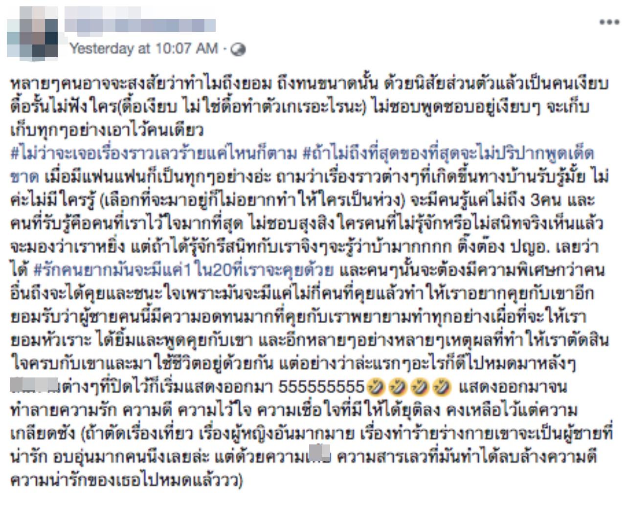 "เหตุผลหลักๆ ที่อยากจะโพสต์เรื่องนี้เพราะอยากแชร์ประสบการณ์ของความรักที่มันโชคร้าย ให้กับเพื่อนๆ ที่ประสบปัญหาเดียวกันอยู่เพราะเชื่อว่ามีหลายคู่ที่เป็นแบบนี้ ได้นึกคิดไตร่ตรองดูให้ดีว่าการที่เราจะรักใครสักคน นอกจากเราจะรักเขาแล้วเขาก็ต้องรักเราด้วยไม่ทำร้ายทุกๆ อย่าง ไม่ว่าจะเป็นทั้งทางกาย วาจา และใจ ต้องให้เกียรติกัน หนักนิดเบาหน่อยถ้าให้อภัยได้ก็ให้อภัย ปรับตัวเข้าหากันกอดกันไว้