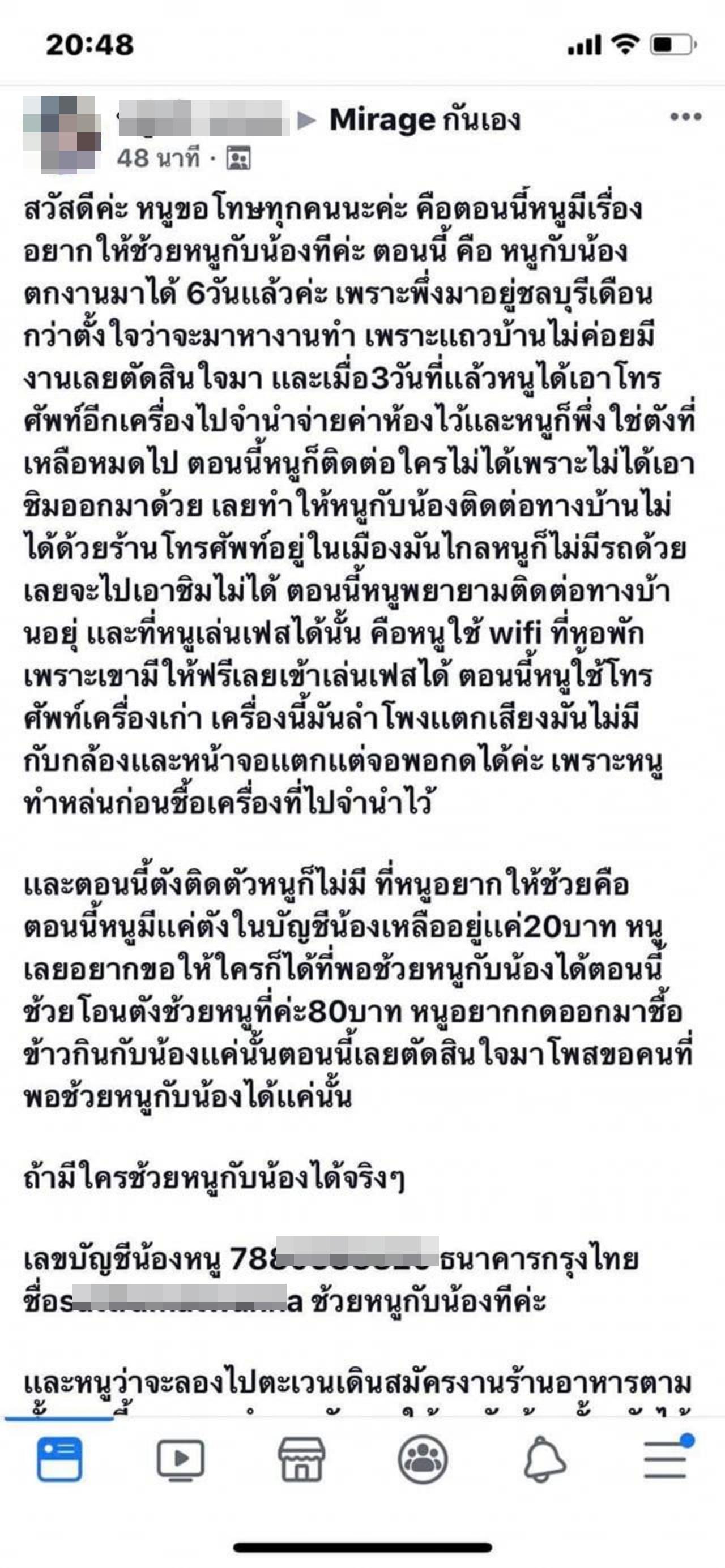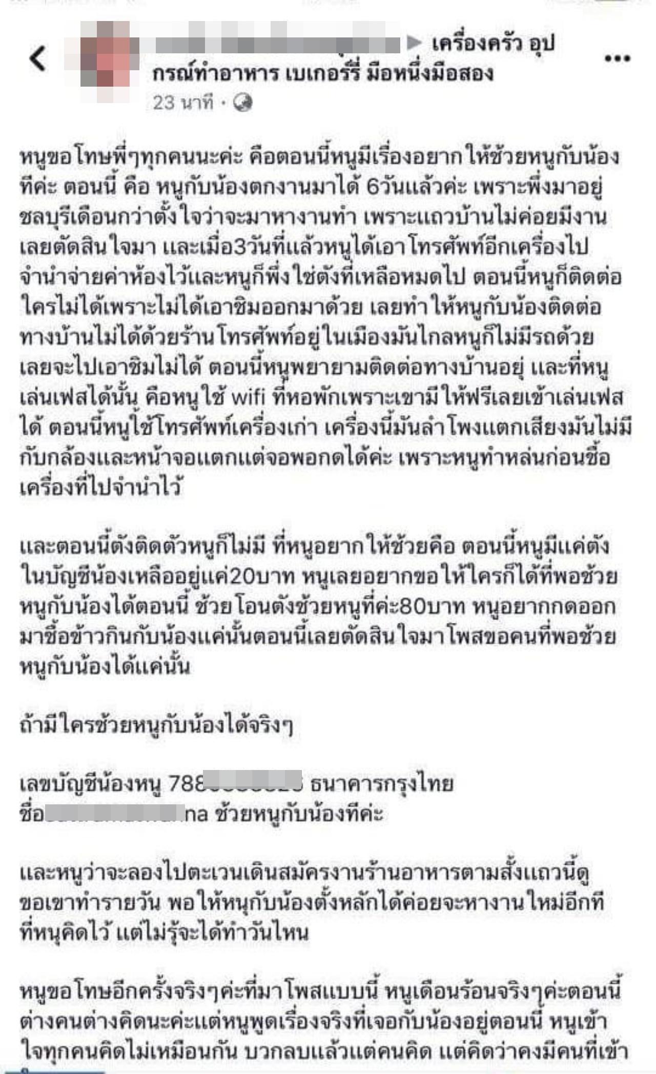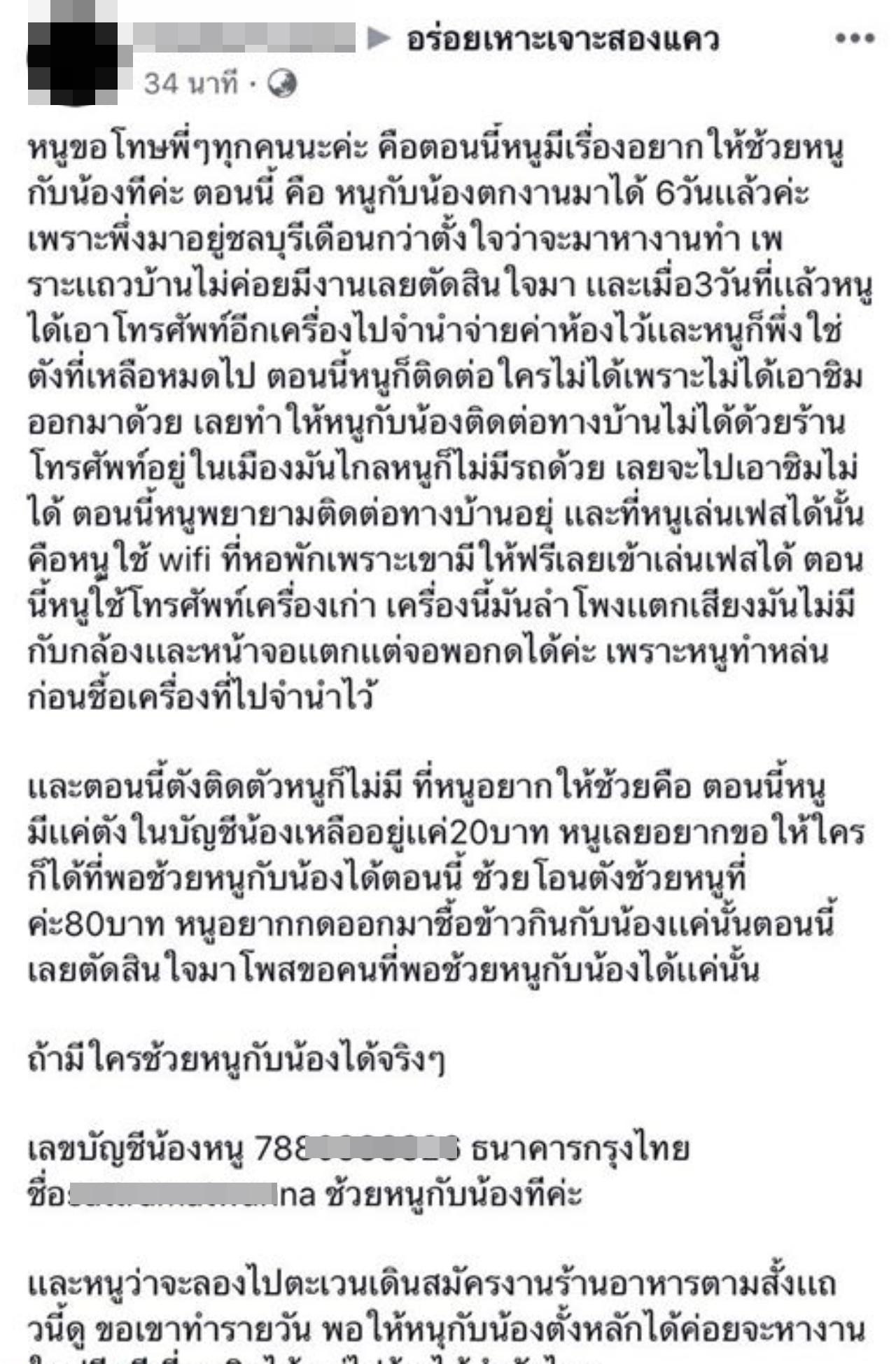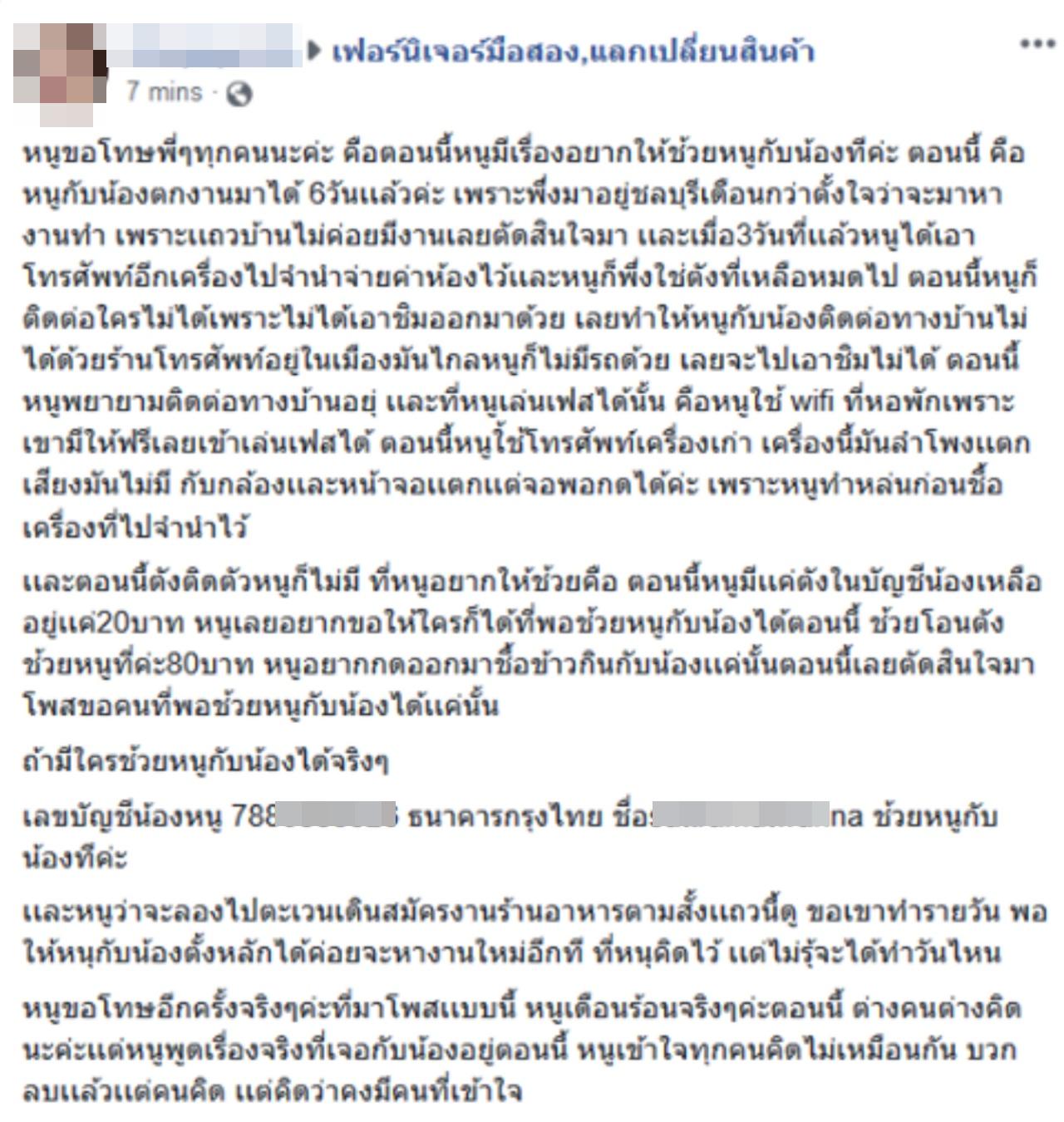 วันที่ 13 ก.ค.62 ผู้สื่อข่าวรายงานว่า จากกระแสข่าวดังเมื่อปี 2561 พบว่าผู้ใช้เฟซบุ๊กรายหนึ่งได้โพสต์ขอความช่วยเหลือ อ้างว่าเพิ่งตกงานไม่มีเงินซื้อข้าว ขอให้ผู้ใจบุญช่วยโอนเงินเข้าบัญชีคนละ 30-60 บาทเพื่อให้ครบ 100 บาท