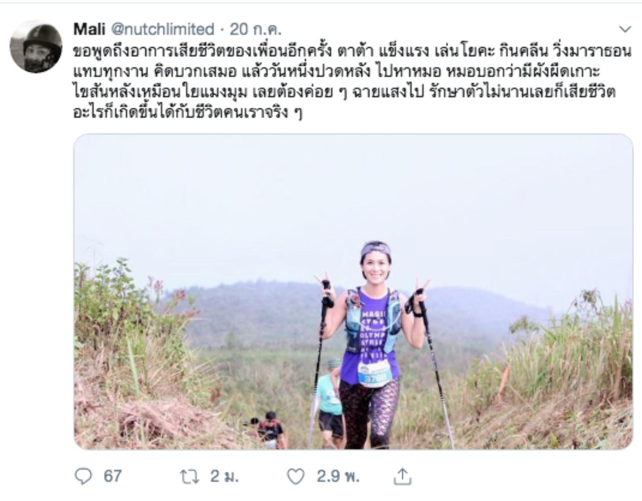 อาลัย "ตาต้า" สาวนักวิ่งมาราธอน ป่วยมะเร็งกระเพาะอาหารระยะสุดท้ายเสียชีวิต หลัง "ตูน บอดี้สแลม" ไปเยี่ยมไม่นาน เพื่อนเผย ก่อนหน้านี้เป็นคนแข็งแรง ไม่เคยป่วย เล่นโยคะ กินคลีน
