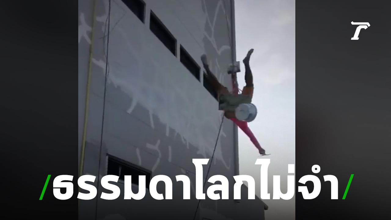 ทาสีบ้านยังไงให้โลกจำ ไม่ต้องใช้นั่งร้าน ช่างใช้เชือกโรยตัวจากอาคาร หมุนตัว สะบัดแปรงอย่างคล่อง ชาวเน็ตบางส่วนห่วงเซฟตี้