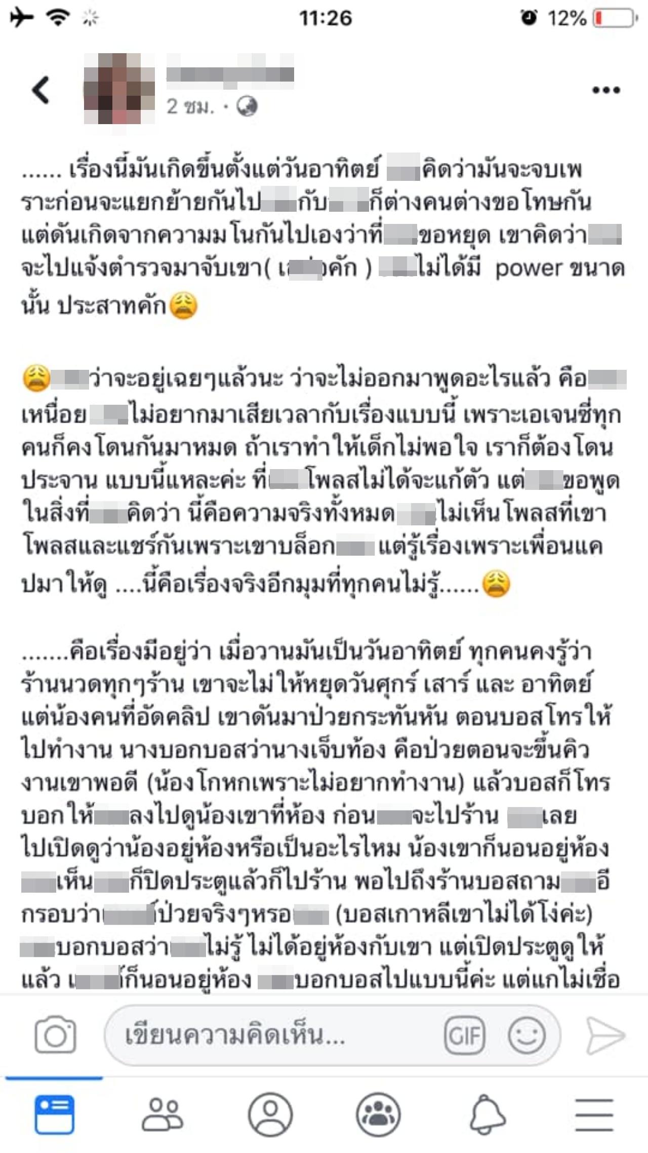 วันที่ 30 ก.ค.62 ผู้สื่อข่าวรายงานว่า ผู้ใช้เฟซบุ๊กรายหนึ่งโพสต์คลิปหญิงเสื้อดำ เป็นเอเจนซี่หาคนไปทำงานร้านนวดที่เกาหลีใต้ ได้เข้ามาทำร้ายหญิงเสื้อขาว ก่อนจะตบตีกันไปมา โดยคาดว่าสาเหตุมาจากหญิงเสื้อขาวได้ป่วยกะทันหันทำให้ไม่สามารถทำงานร้านนวดได้ หญิงเสื้อดำจึงลงมาตามที่ห้อง