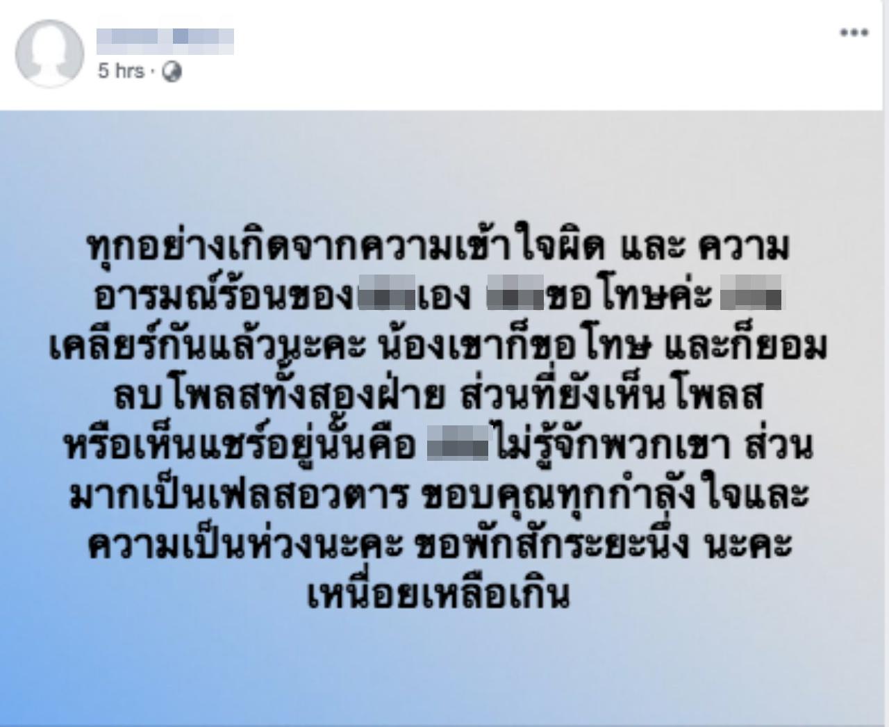 ต่อมา มีรายงานว่า หญิงเสื้อดำได้โพสต์ข้อความชี้แจงว่า ทุกอย่างเกิดจากความเข้าใจผิด และความอารมณ์ร้อนของตนเอง ตอนนี้เคลียร์กันแล้วนะคะ น้องเขาก็ขอโทษ และก็ยอมลบโพสต์ทั้งสองฝ่าย ส่วนที่ยังเห็นโพสต์ หรือเห็นแชร์อยู่นั้นคือ ตนไม่รู้จักพวกเขา ขอบคุณทุกกำลังใจและความเป็นห่วงนะคะ ขอพักสักระยะนึงนะคะ เหนื่อยเหลือเกิน.