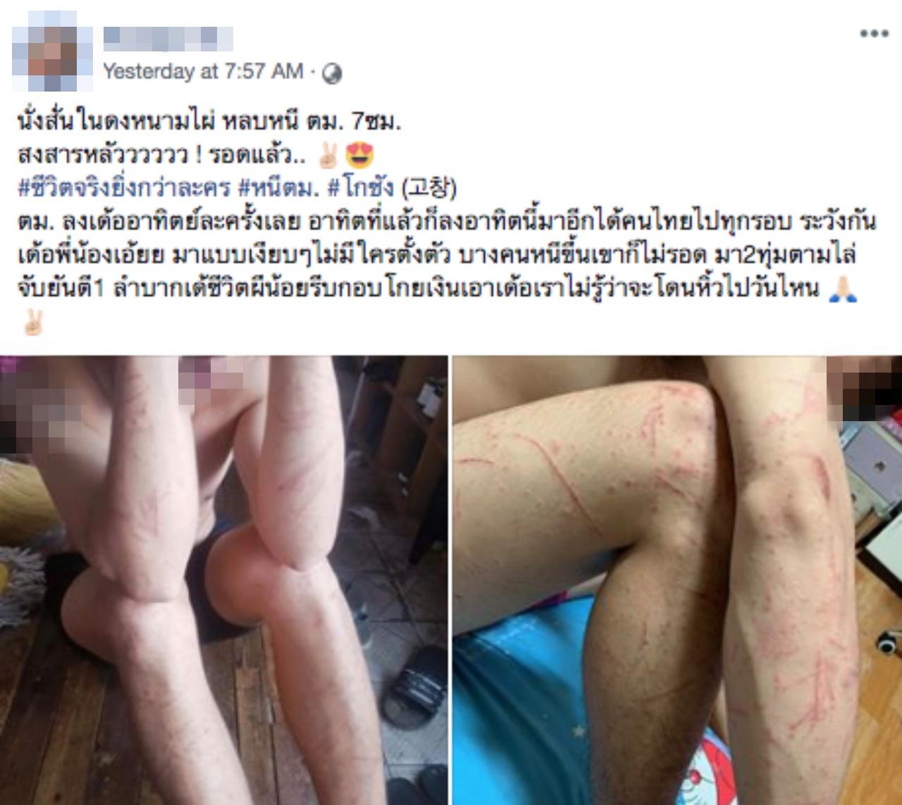 วันที่ 31 ก.ค.62 ผู้สื่อข่าวรายงานว่า โลกออนไลน์แชร์ภาพชายคนหนึ่ง มีรอยขีดข่วนทั้งตัว โดยระบุว่า ชายคนดังกล่าวลักลอบเข้าไปทำงานในเกาหลีใต้อย่างผิดกฎหมาย ต้องหลบหนีตำรวจตรวจคนเข้าเมือง (ตม.) ไปหลบซ่อนตัวอยู่ในดงไผ่ถึง 7 ชม.