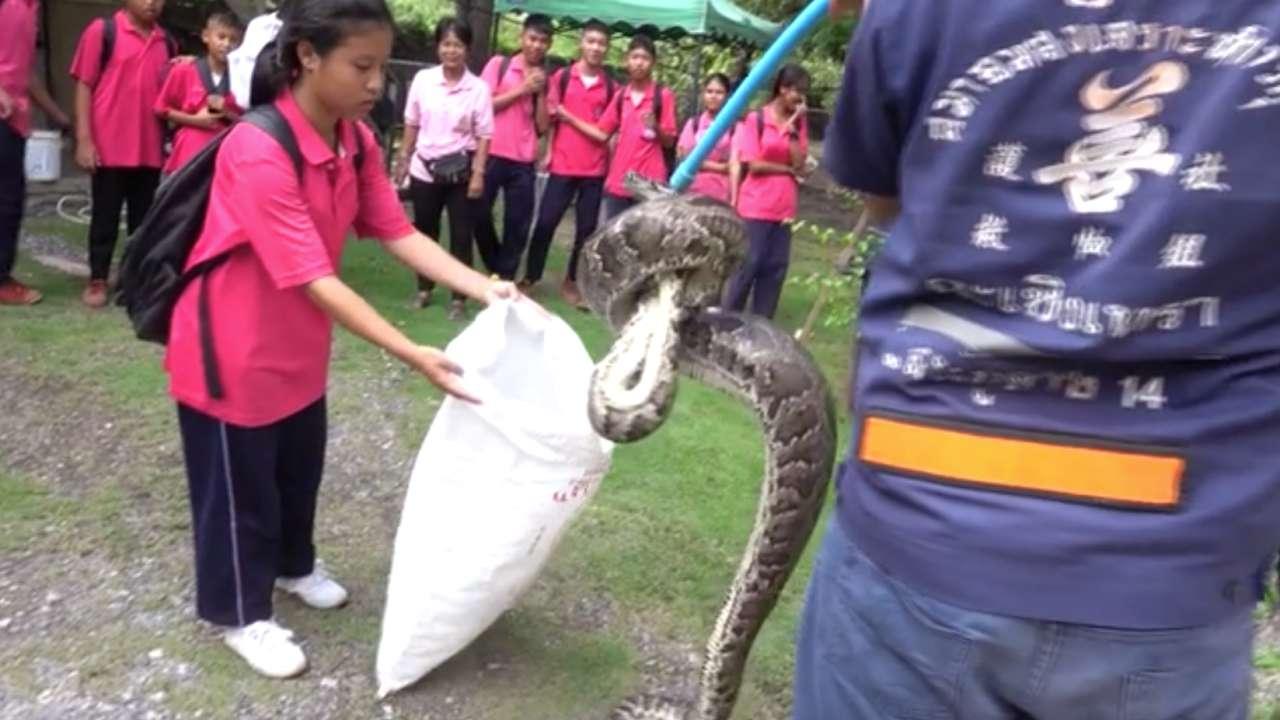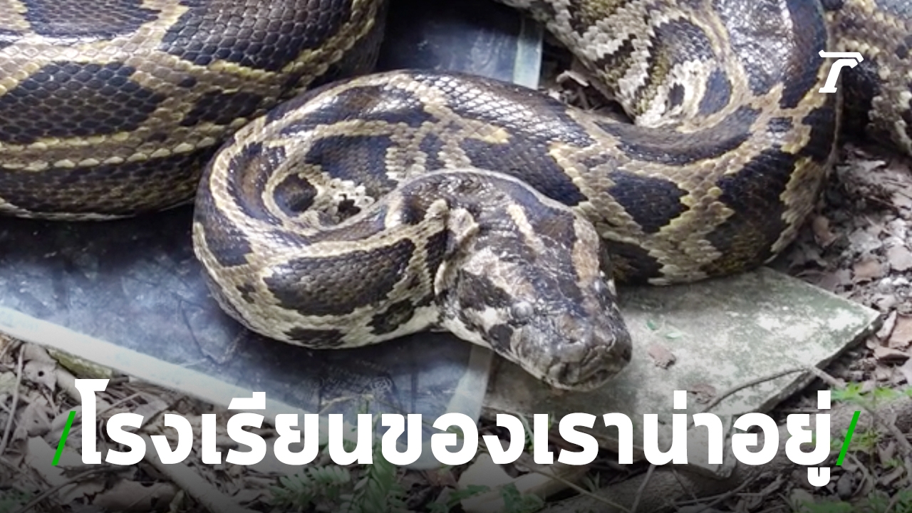 รวบงูหลามยาว 4 เมตร แอบเลื้อยเข้ามาหลบข้างบ้านพักภายในโรงเรียนพุทธิรังสีพิบูล