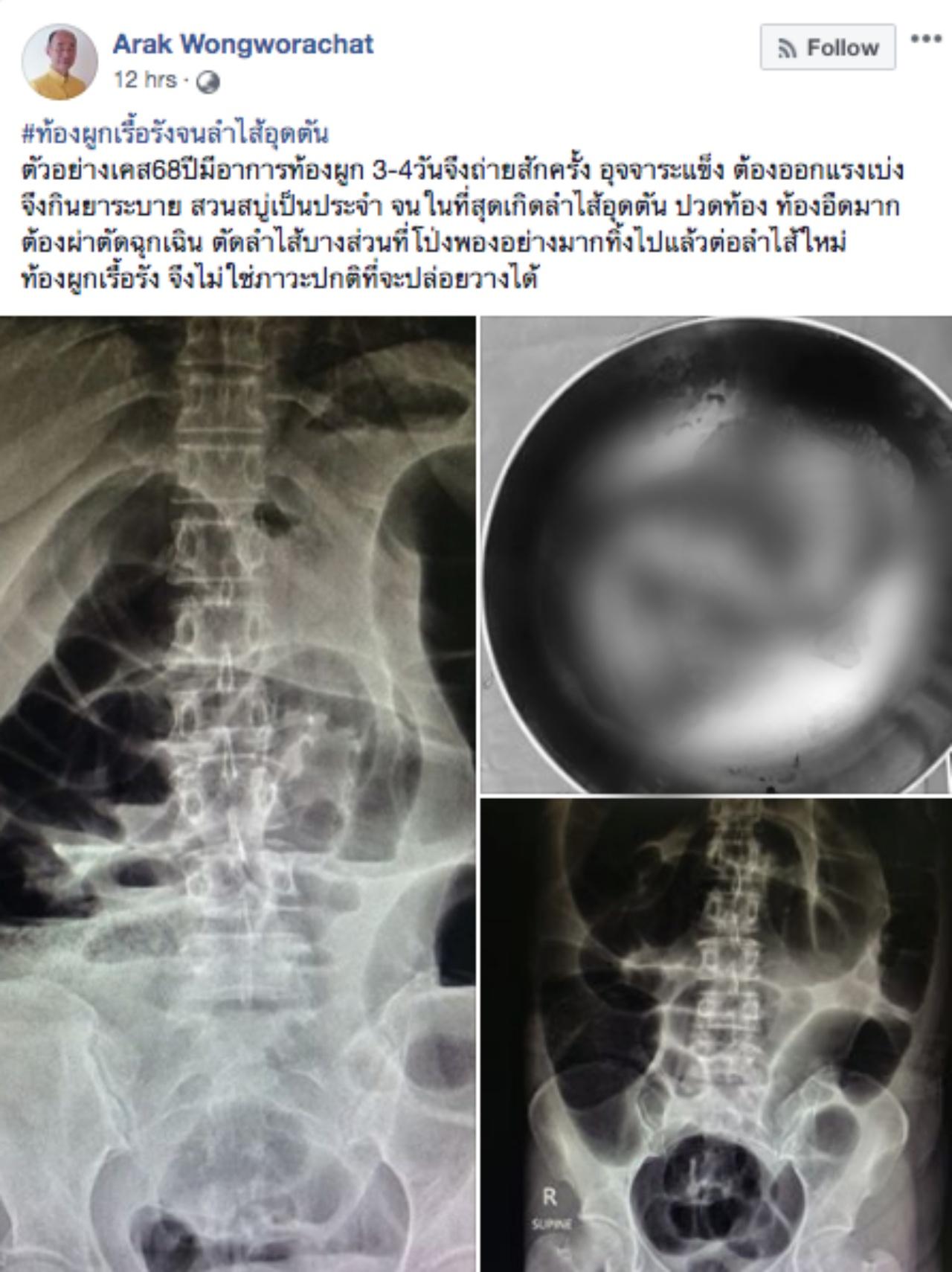 วันที่ 18 ส.ค.62 นพ.อารักษ์ วงศ์วรชาติ ผู้อำนวยการโรงพยาบาลสิชล จ.นครศรีธรรมราช โพสต์ภาพและข้อความเตือนภัยกรณีท้องผูกเรื้อรังจนลำไส้อุดตัน โดยยกตัวอย่าง คนไข้อายุ 68 ปี มีอาการท้องผูก 3-4 วันจึงจะขับถ่าย อุจจาระแข็ง กินยาระบาย มีการสวนสบู่เป็นประจำ