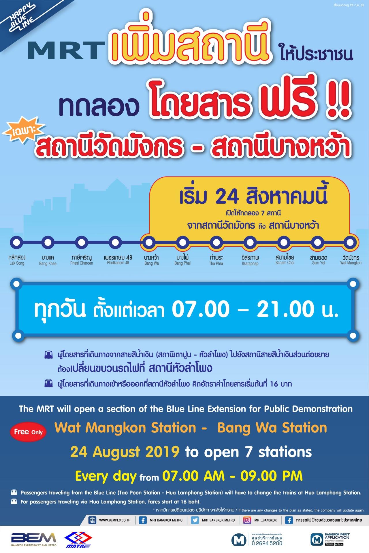 ผู้สื่อข่าวรายงานว่า ตามที่การรถไฟฟ้าขนส่งมวลชนแห่งประเทศไทย (รฟม.) ร่วมกับ บริษัท ทางด่วนและรถไฟฟ้ากรุงเทพ จำกัด (มหาชน) (BEM) เปิดให้ประชาชนทดลองใช้บริการรถไฟฟ้าสายสีน้ำเงิน ส่วนต่อขยายช่วงหัวลำโพง–บางแค จากสถานีวัดมังกร–สถานีท่าพระ โดยไม่คิดค่าโดยสาร ตั้งแต่วันที่ 29 ก.ค.62 นั้น