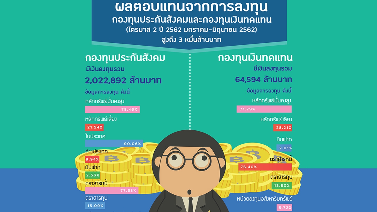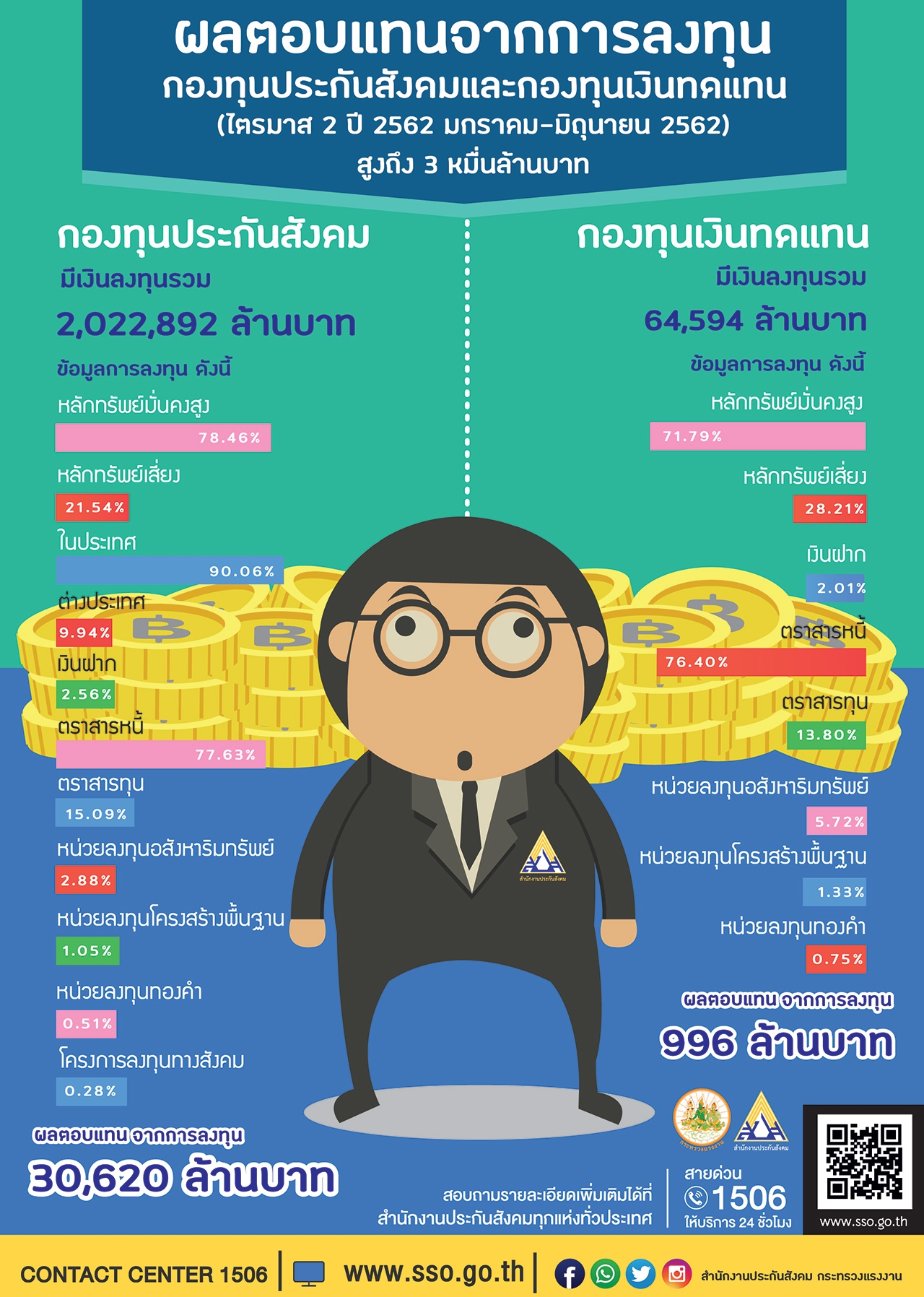 นายอนันต์ชัย อุทัยพัฒนาชีพ เลขาธิการสำนักงานประกันสังคม กระทรวงแรงงาน เปิดเผย ผลการดำเนินงานการบริหารการลงทุนประกันสังคม กองทุนประกันสังคมและกองทุนเงินทดแทน ในไตรมาสที่ 2 ปี 2562 ช่วงระหว่างเดือนมกราคม–มิถุนายน 2562 ว่า สถานะเงินลงทุนของกองทุนประกันสังคม ณ 30 มิถุนายน 2562 มีเงินลงทุนจำนวน 2.02 ล้านล้านบาท ประกอบด้วยเงินสมทบที่จัดเก็บจากผู้ประกันตน นายจ้าง และรัฐบาล จำนวน 1.41 ล้านล้านบาท และดอกผลจากการลงทุนสะสม 611,017 ล้านบาท โดยเงินลงทุนสามารถแบ่งออกเป็น หลักทรัพย์ที่มีความมั่งคงสูงร้อยละ 78.5 และหลักทรัพย์เสี่ยงร้อยละ 21.5 ซึ่งเป็นไปตามระเบียบคณะกรรมการประกันสังคม ที่กำหนดกรอบการลงทุนในหลักทรัพย์เสี่ยงไม่เกินร้อยละ 40 และอยู่ภายใต้ค่าความเสี่ยงที่คณะกรรมการกำหนด ทั้งนี้ ในไตรมาส 2 ปี 2562 ตั้งแต่มกราคม–มิถุนายน 2562 สำนักงานประกันสังคมสามารถสร้างผลตอบแทนกองทุนประกันสังคมได้ จำนวน 30,620 ล้านบาท