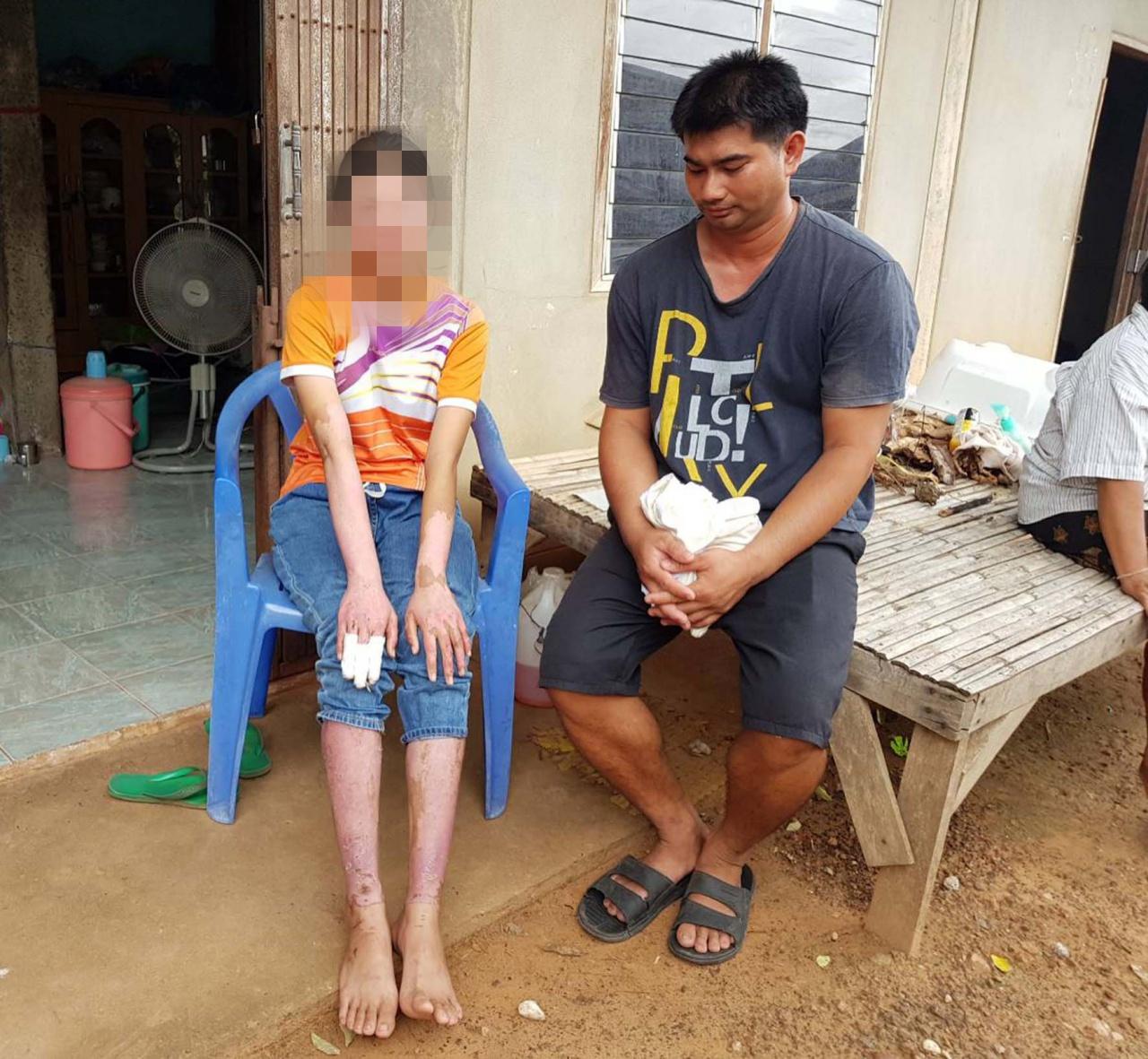 เมื่อได้น้ำมันมา ก็นำมาราดลงที่ปล่องด้านบน เพื่อความแน่ใจว่าน้ำมันที่ราดลงในเตาเผานั้น ไหลลงไปถึงไม้ด้านล่างหรือไม่ ตนจึงนั่งคุกเข่า ก้มลงไปมองในเตาเผา ไม่นานไฟก็ลุกพึ่บออกมาลวกตามใบหน้าและลำตัวของตนกับเพื่อนอีกคน ตอนนั้นไม่มีใครช่วย กระทั่งพ่อไปรับที่โรงเรียน จึงพาตนและเพื่อนส่งไปที่ รพ.น้ำพอง ตนรักษาตัวที่ รพ.น้ำพอง 1 วัน จากนั้นถูกส่งตัวไปรักษาต่อที่ รพ.ขอนแก่น เป็นเวลา 1 อาทิตย์ ก่อนกลับออกมารักษาตัวต่อที่บ้าน