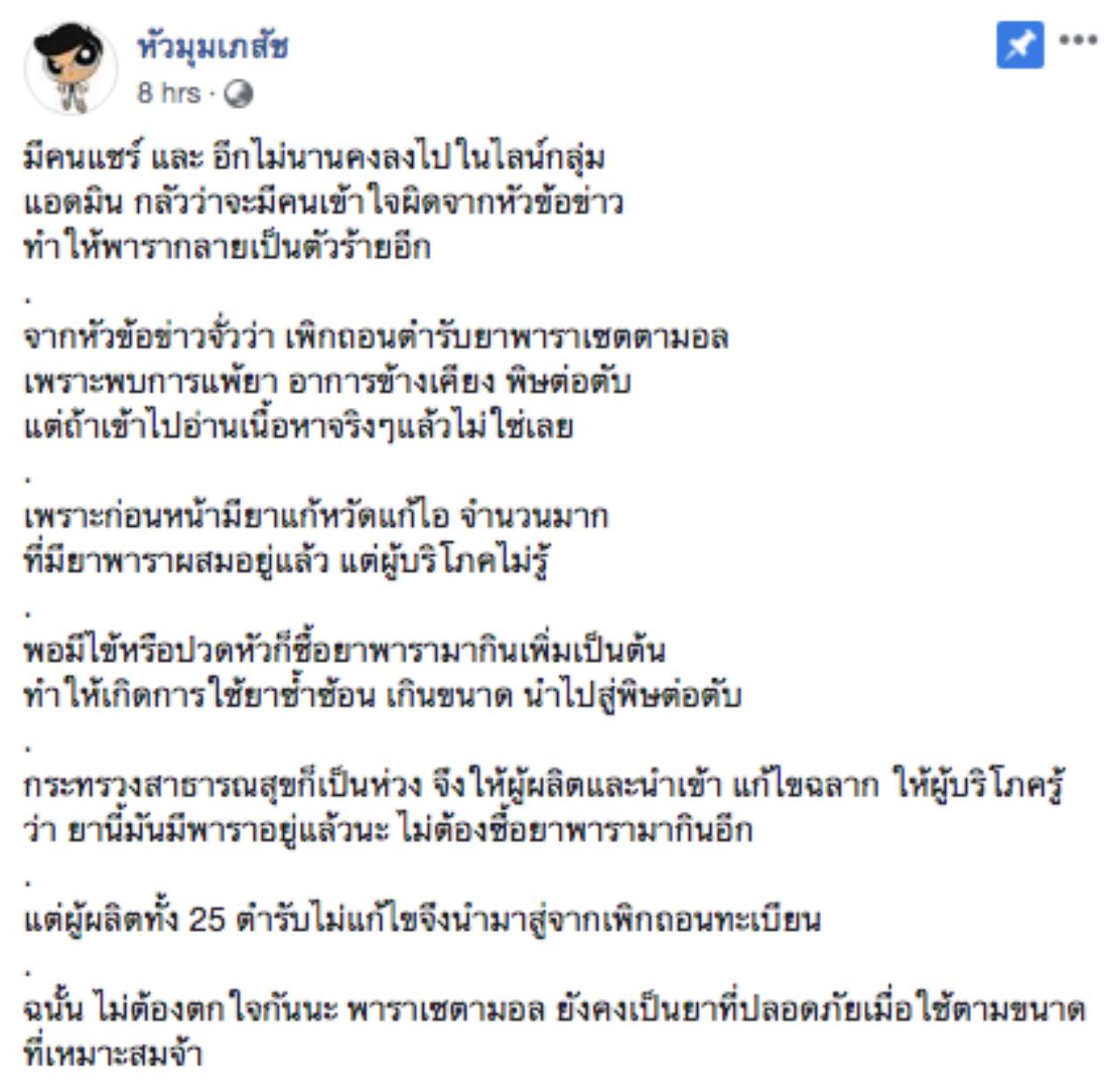 ล่าสุด วันที่ 12 ก.ย.62 แฟนเพจ หัวมุมเภสัช ของ ภก.ธีรภัทร ชัยจินดารัตน์ โพสต์ถึงกรณีดังกล่าวว่า จากหัวข้อข่าวจั่วว่า เพิกถอนตำรับยาพาราเซตามอล เพราะพบการแพ้ยา อาการข้างเคียง พิษต่อตับ แต่ถ้าเข้าไปอ่านเนื้อหาจริงๆ แล้วไม่ใช่เลยเพราะก่อนหน้ามียาแก้หวัดแก้ไอจำนวนมากที่มียาพาราผสมอยู่แล้ว แต่ผู้บริโภคไม่รู้