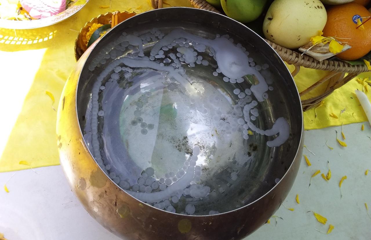 หลังบวงสรวงเสร็จ ได้ส่องดูที่ขันน้ำมนต์ที่พ่อจ้ำทำในขณะบวงสรวง น้ำตาเทียนออกมาคล้ายกับครั้งก่อนคล้ายพญานาค ครั้งนี้น้ำตาเทียนออกมาคล้ายกันกับครั้งก่อนที่ตนโชคดี ครั้งนี้น้ำตาเทียนคล้ายพญานาคเป็นเลข 8 ส่วนอีกจุดเห็นเมือนตัว ร. ตัวเองมองตัว ร.เท่ากับเลข 5 ผู้โชคดีชอบตัวเลข 85, 58 ตามความเชื่อของแต่ละบุคคล.